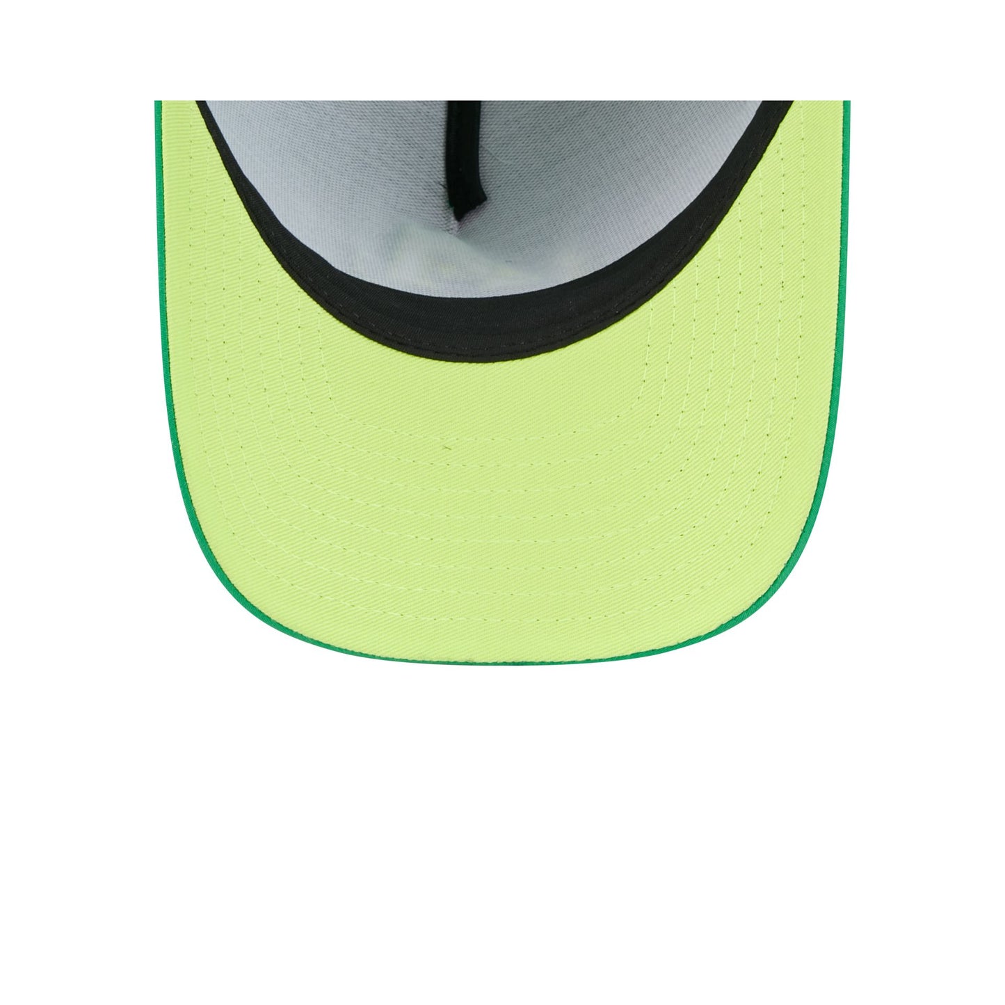 The Arizona Diamondbacks Tee Time 9FORTY M-Crown A-Frame Snapback features an embroidered Diamondbacks golf logo at the front panels with a snapback closure at the rear and a neon green undervisor.