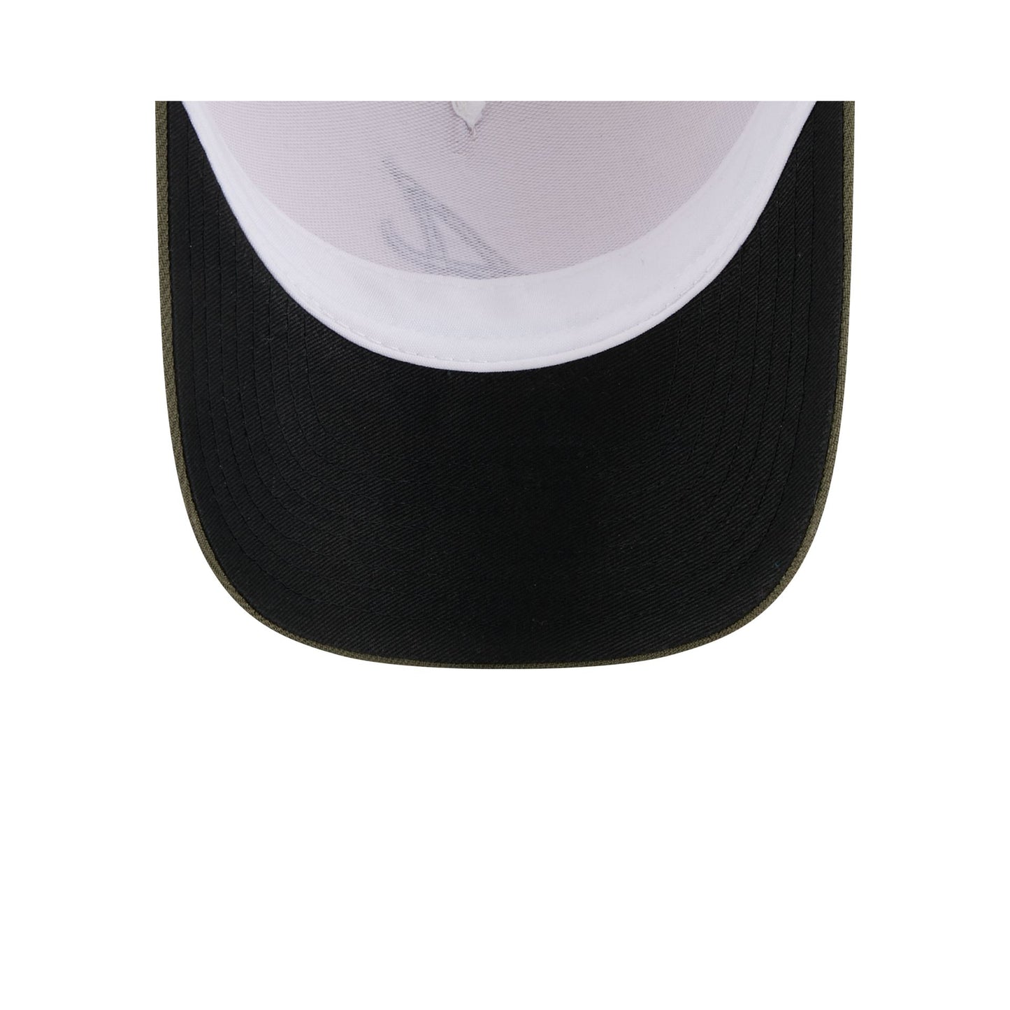 The Atlanta Braves Armed Forces Day 2025 9FORTY M-Crown A-Frame Trucker features an embroidered Braves logo at the front panels with the American Flag embroidered at the right-wear side. Additional details include an MLB Batterman logo above a snapback closure at a mesh rear and a black undervisor.