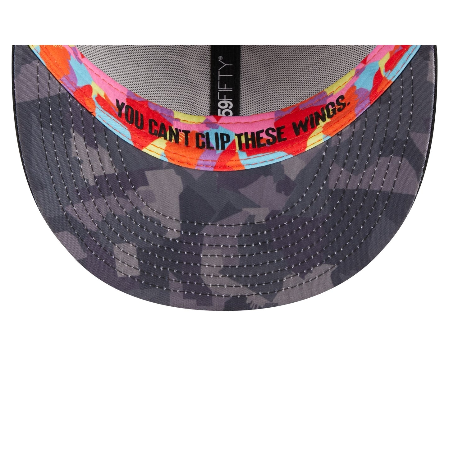 Jersey inspired, city connected. The Baltimore Orioles City Connect Low Profile 59FIFTY Fitted Cap draws originality from unique elements tied to the surrounding city and features an embroidered Orioles logo at the front panels with a matching MLB Batterman logo at the rear. Additional details include a printed sweatband reading "YOU CAN'T CLIP THESE WINGS." and a gray camo undervisor.