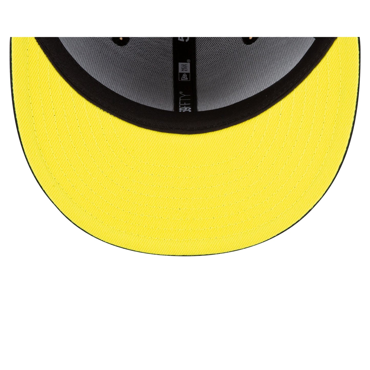 The SpongeBob SquarePants Pineapple 59FIFTY Fitted Cap features an embroidered Pineapple house that SpongeBob lives in embroidered at the front panels with a Bikini Bottom logo at the rear and a yellow undervisor.