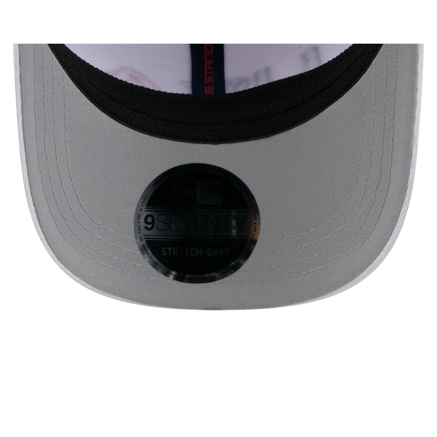 The 2025 Ryder Cup Team USA White 9SEVENTY Stretch-Snap features an embroidered Team USA logo at the front panels with a silicone Ryder Cup logo above an adjustable snapback closure at the rear. Additional details include a Ryder Cup pin flag at the front left panel and a gray undervisor.