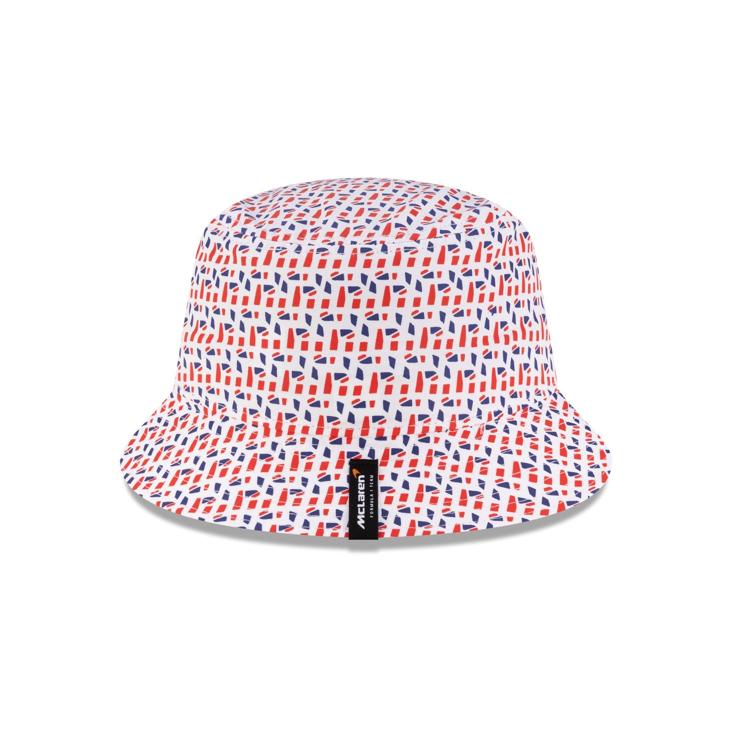 The 2025 Silverstone Race Special Lando Norris McLaren Formula 1 Team Bucket Hat features an embroidered McLaren Racing logo at the front with a Union Jack Flag inspired LN all-over print crown and a woven team tag at the rear.