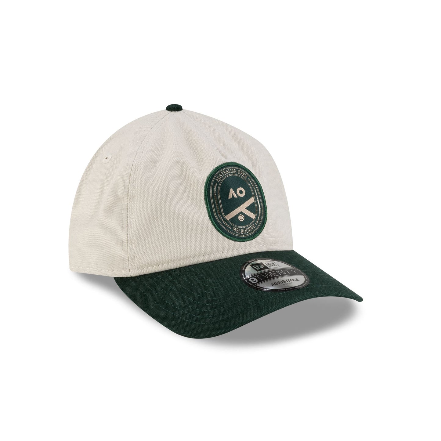 The 2026 Australian Open Heritage Dark Green 9TWENTY A-Frame Adjustable Cap features an embroidered Australian Open patch at the front panels with a wordmark above an adjustable buckle closure.