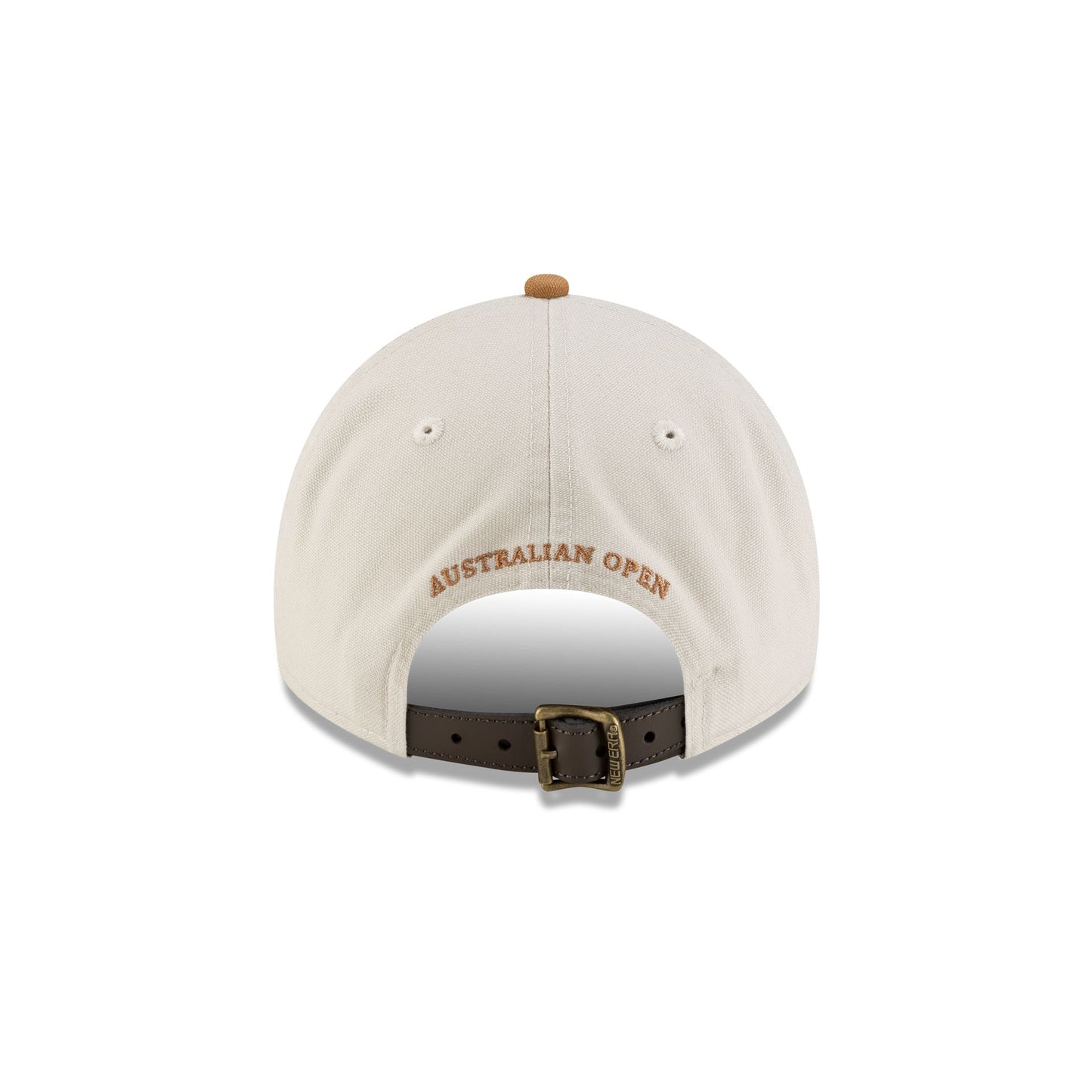 The 2026 Australian Open Heritage Khaki 9TWENTY A-Frame Adjustable Cap features an embroidered Australian Open patch at the front panels with a wordmark above an adjustable buckle closure.