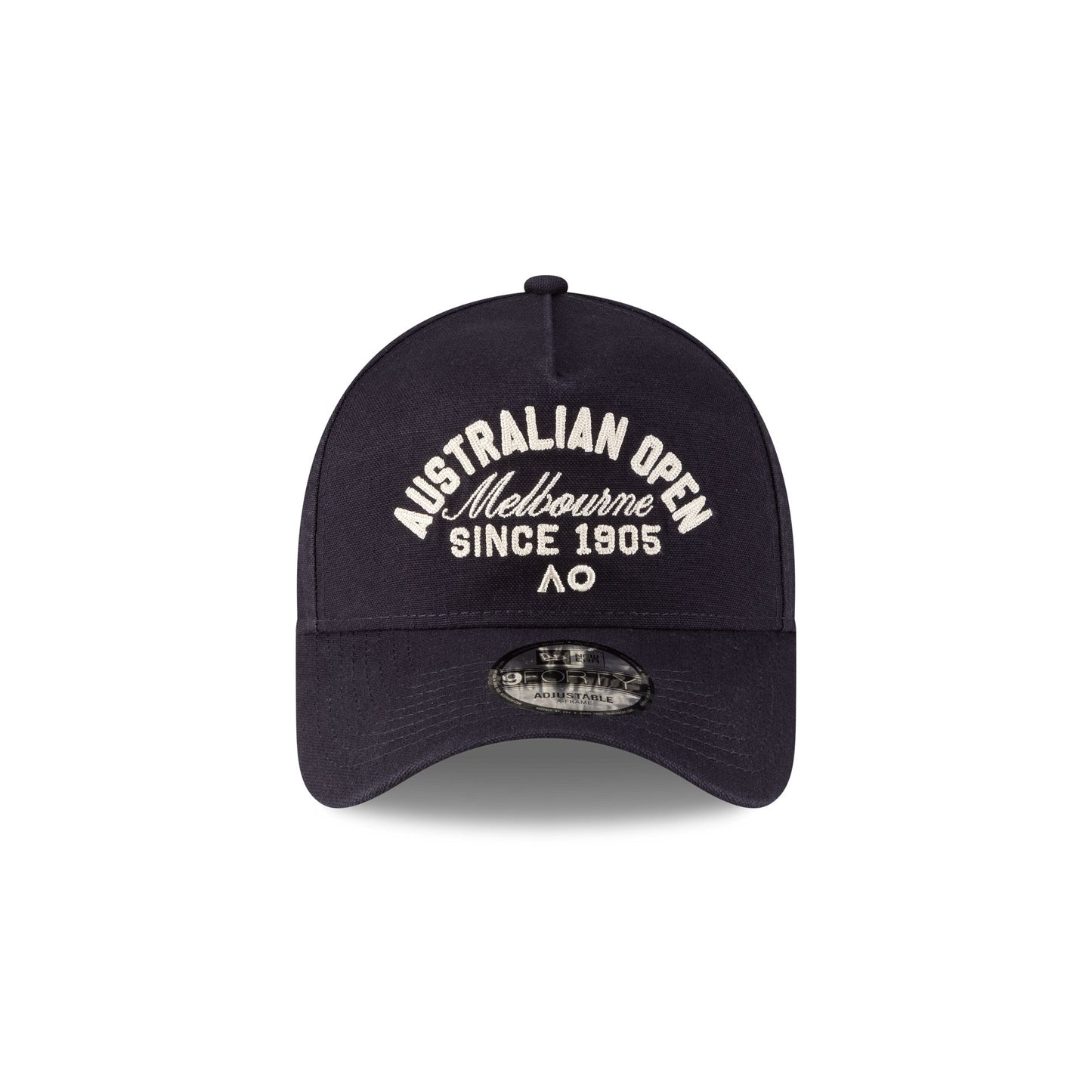 The 2026 Australian Open Navy Script 9FORTY A-Frame Snapback features an embroidered Australian Open Melbourne script graphic at the front panels with an adjustable snapback closure at the rear and a gray undervisor.