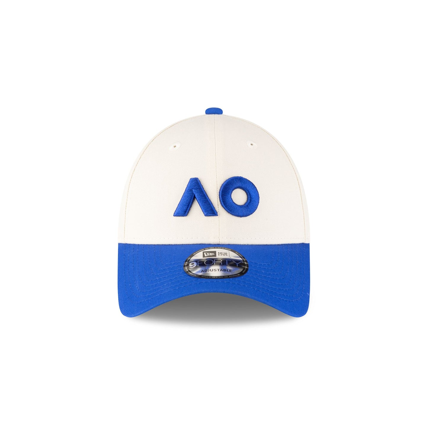 The 2026 Australian Open Two Tone Blue 9FORTY Adjustable Cap features an embroidered Australian Open logo at the front panels with an Australian Open wordmark above an adjustable D-Ring closure at the rear.