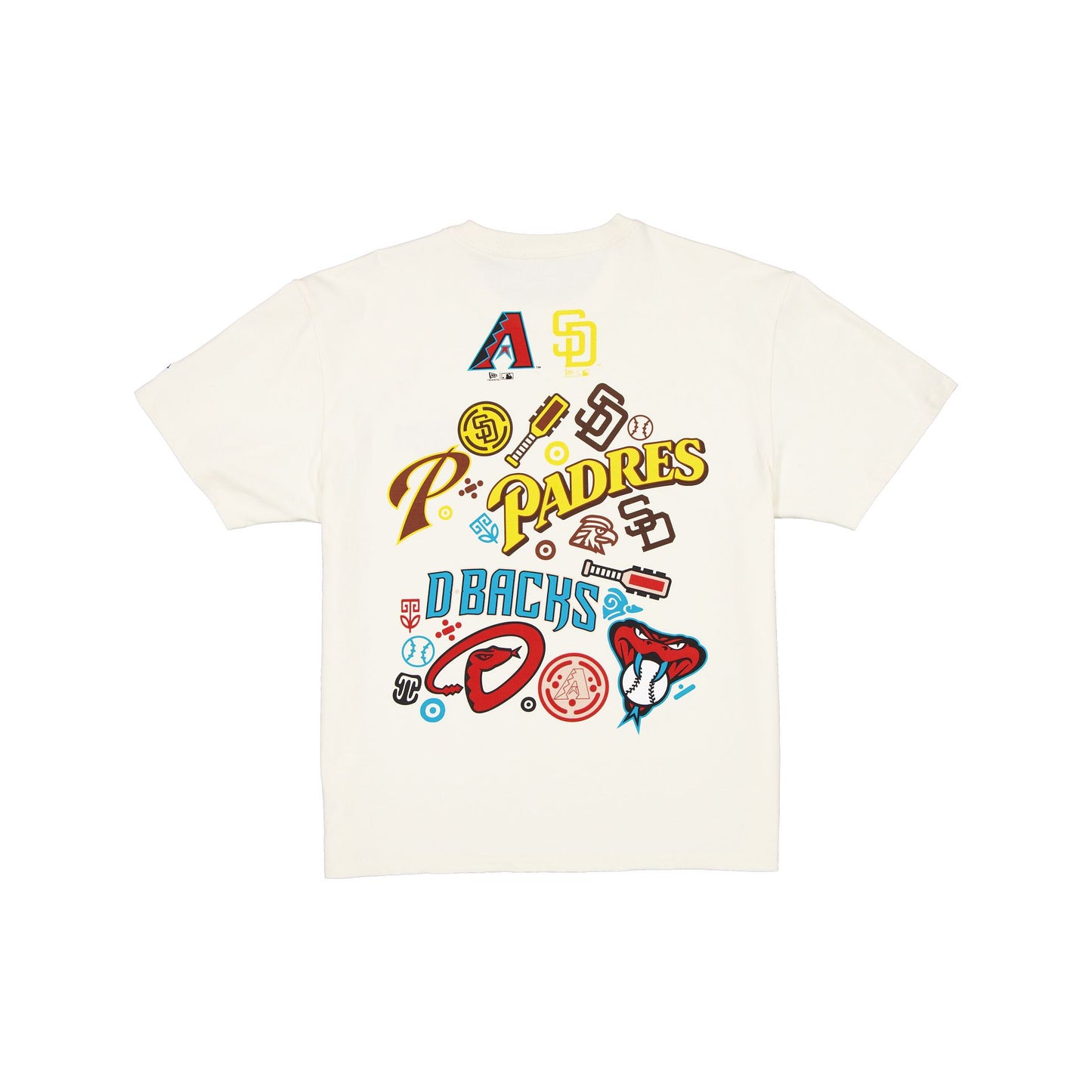 The 2026 MLB World Tour Mexico City Series All Over T-Shirt features an embroidered MLB 2026 MLB World Tour Mexico City Series graphic at the left chest. Additional details include various team logos at the rear.
