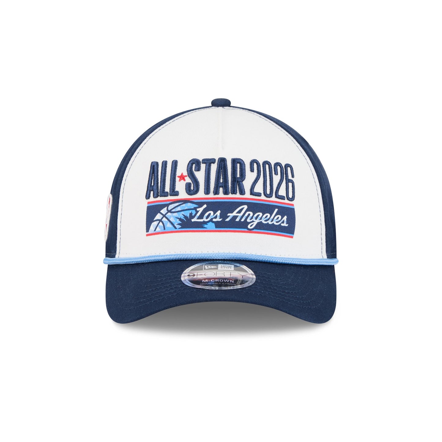 The 2026 NBA All-Star Game 9FORTY M-Crown A-Frame Snapback features an embroidered 2026 NBA All-Star Game Los Angeles wordmark at the front panel with a gray undervisor. Additional details include an NBA Logoman patch at the right-wear side and an adjustable snapback closure at the rear.