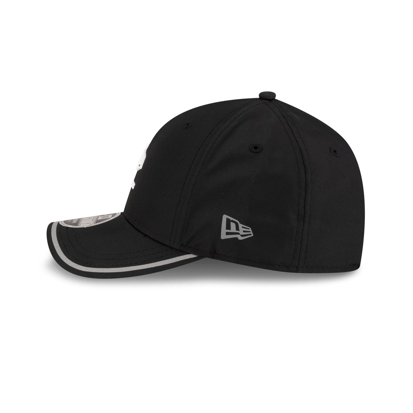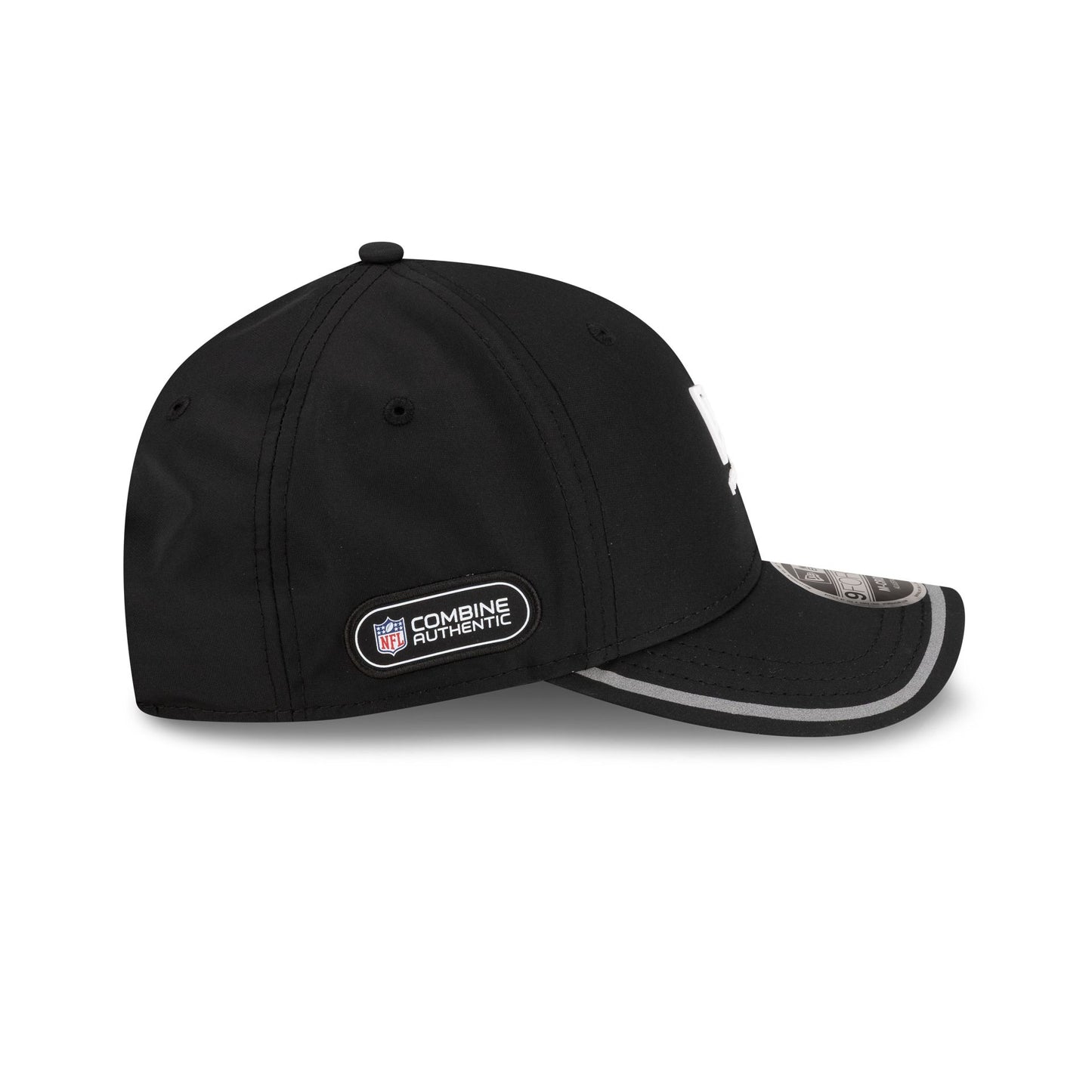 The 2026 NFL Combine 9FORTY M-Crown Adjustable Cap features a silicone New Era Cap logo at the front panels with a woven NFL Combine patch at the right-wear side. Additional details include a reflective strip detail at the visor with a black undervisor and an adjustable hook and loop closure at the rear.