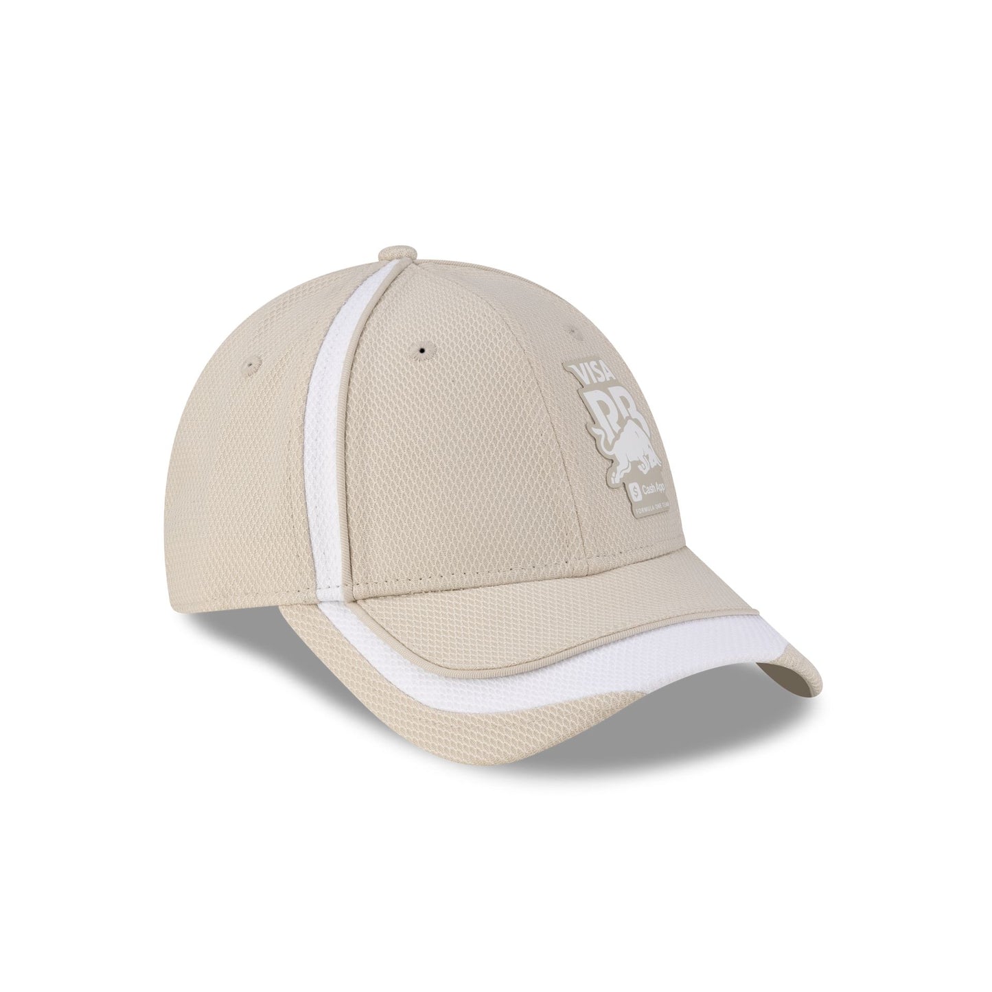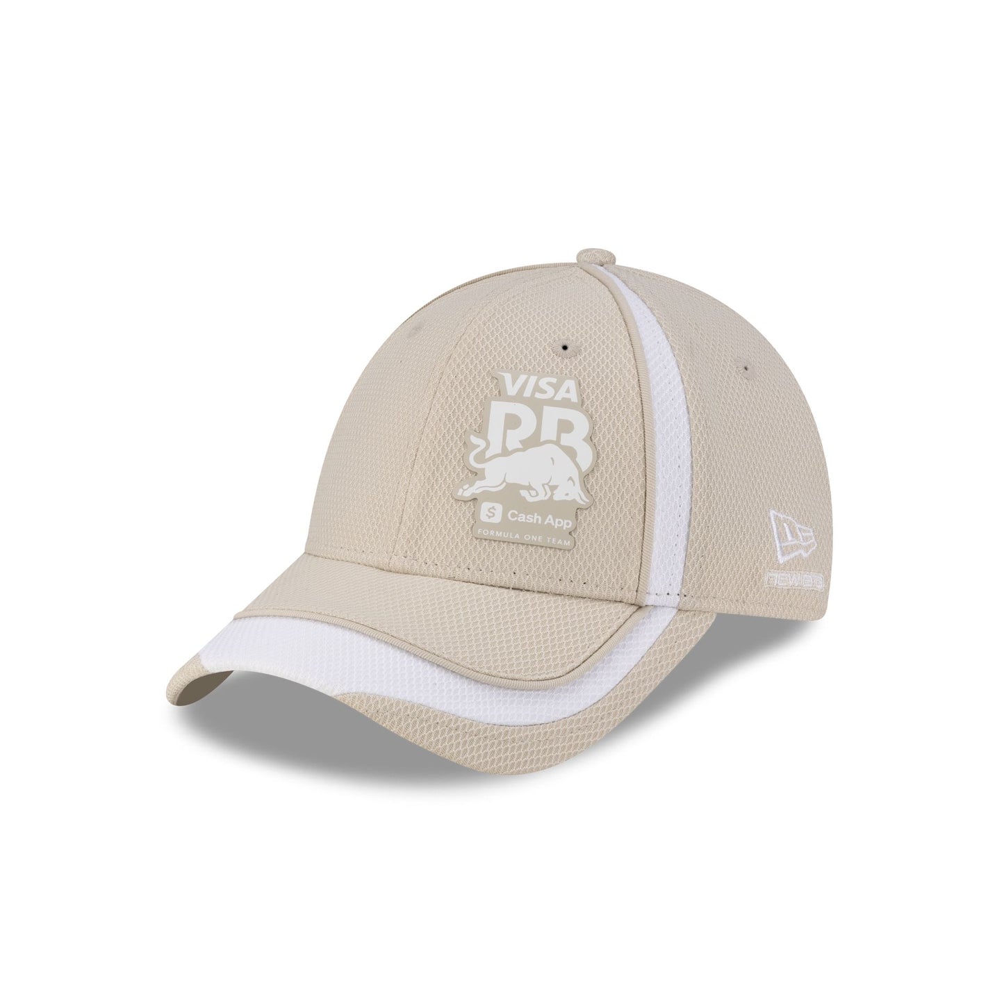 The 2026 Race Special Visa Cash App Racing Bulls Sand 9FORTY Snapback features a screen-printed Racing Bulls logo at the front panel with stone and white details at the crown and visor. Additional details include a mesh all over fabrication with embroidered New Era Flag at the left-wear side, a stone undervisor, and an adjustable snapback closure at the rear.