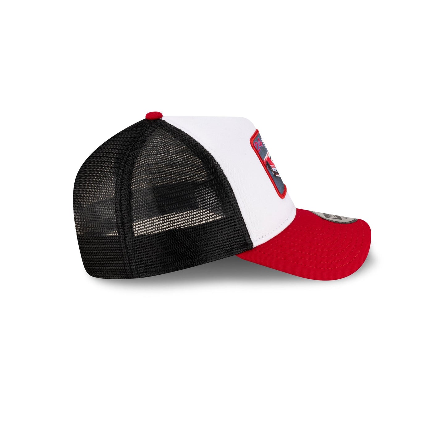 The 24 Hours of Le Mans Patch Red 9FORTY A-Frame Trucker features a sublimated 24h Le Mans patch at the front panels with a woven loop label above a snapback closure at a mesh rear.