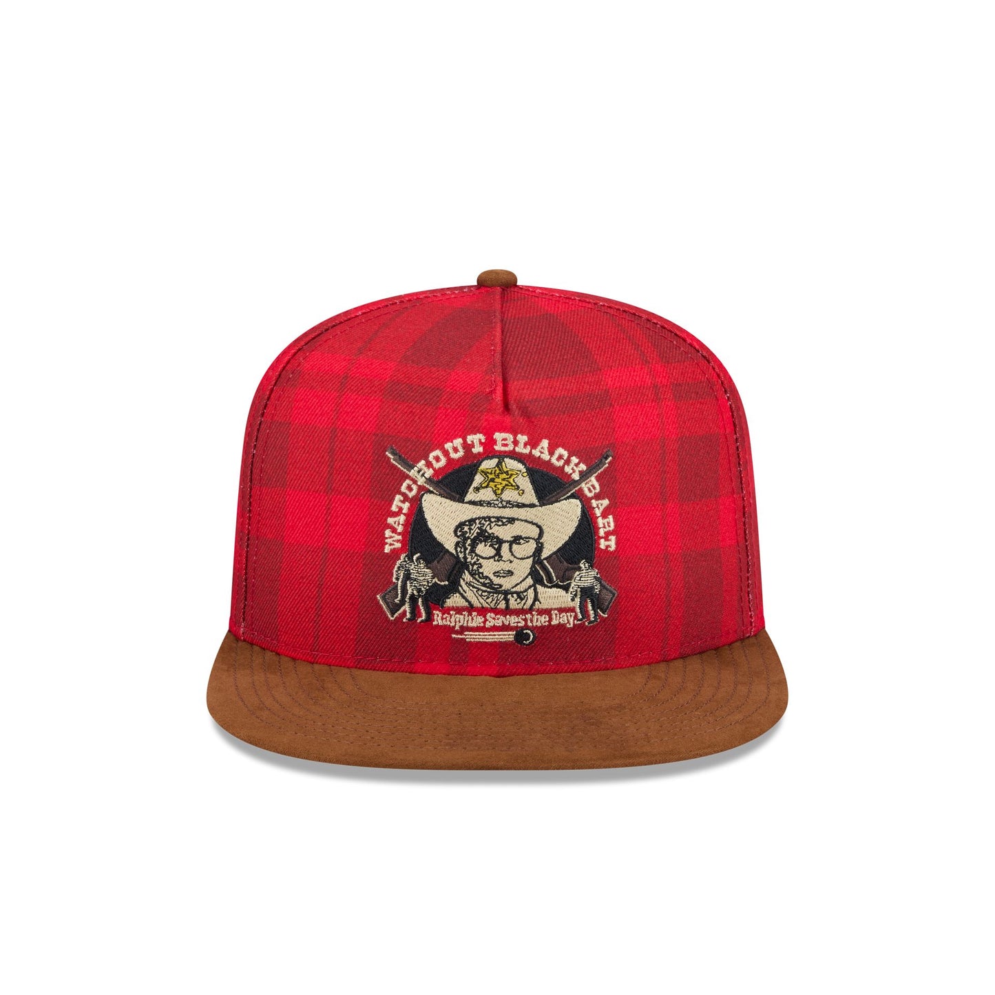 The A Christmas Story Watchout Black Bart 9FIFTY A-Frame Snapback features an embroidered A Christmas Story Ralphie Saves the Day wordmark and graphic at the front panel with a snapback closure at the rear and a brown suede visor.