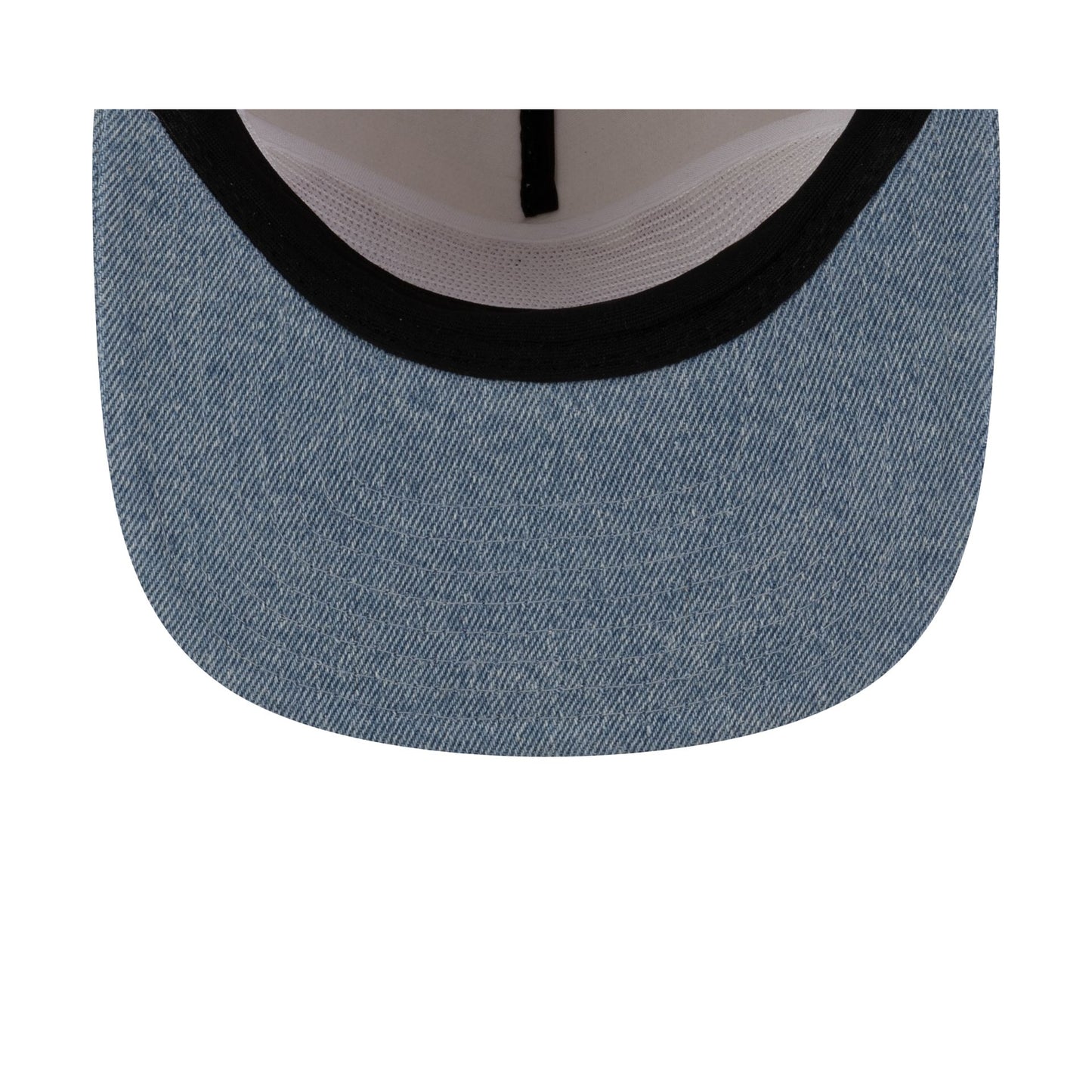 The AC Milan Denim Visor Golfer features an embroidered Milan patch at the front panels with matching team patches at the right-wear side and a woven team logo tag at an adjustable snapback closure at the rear.