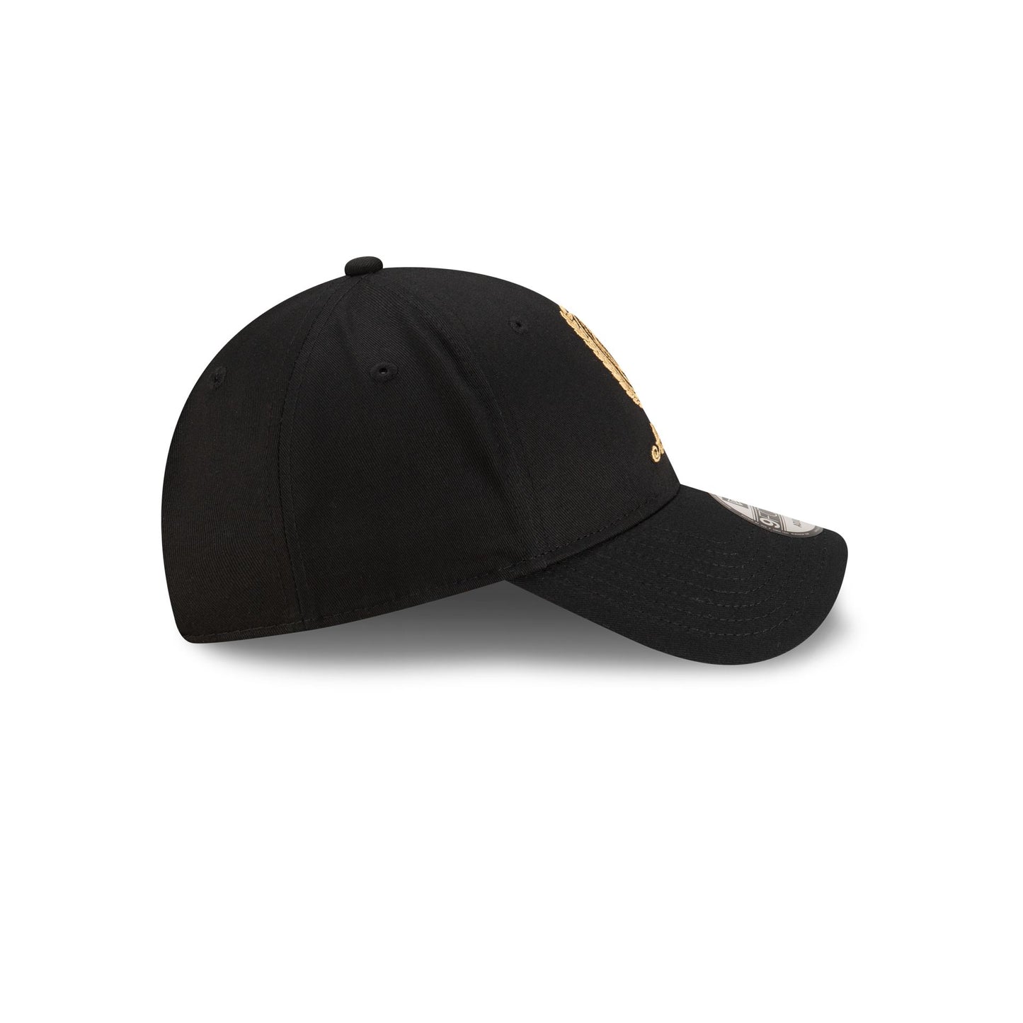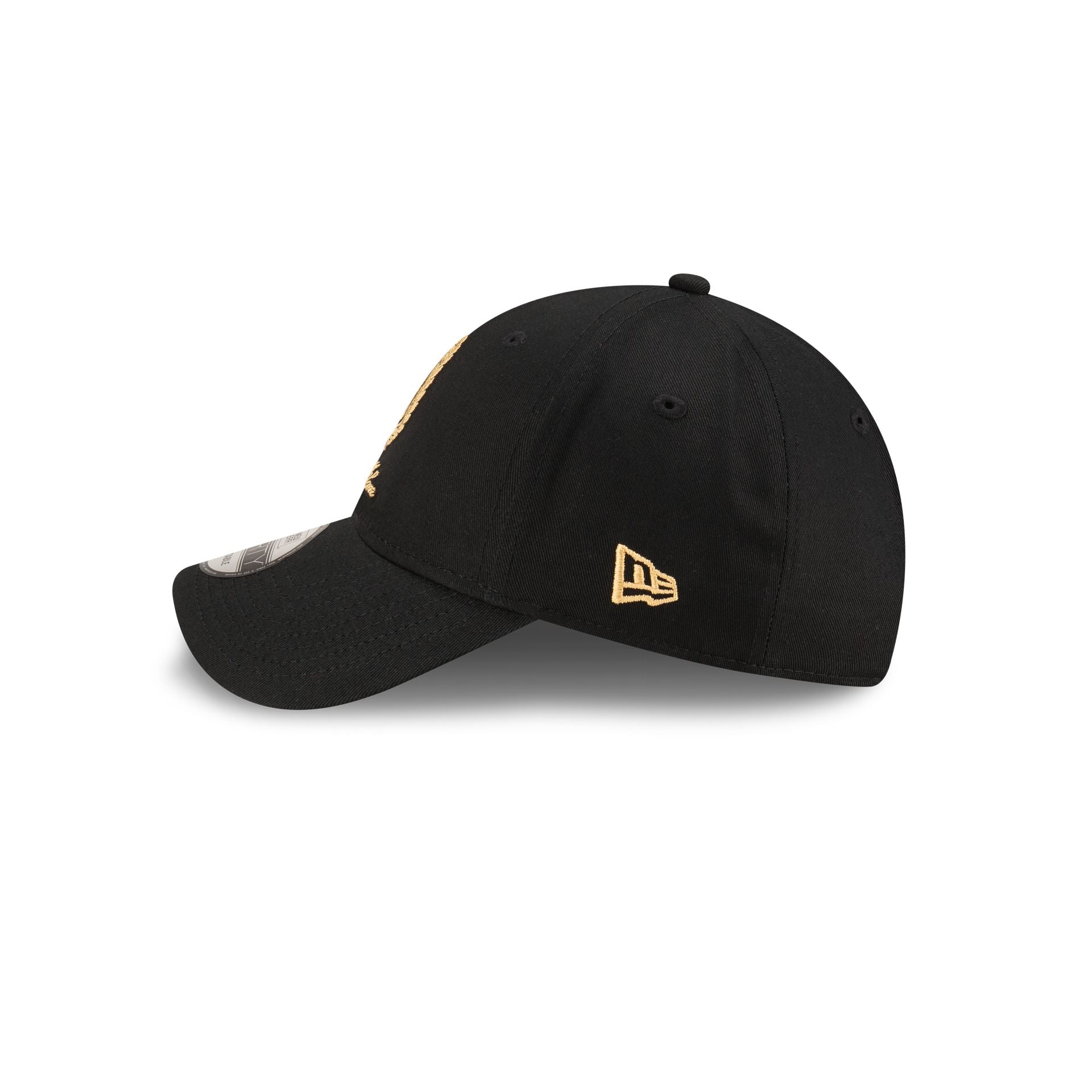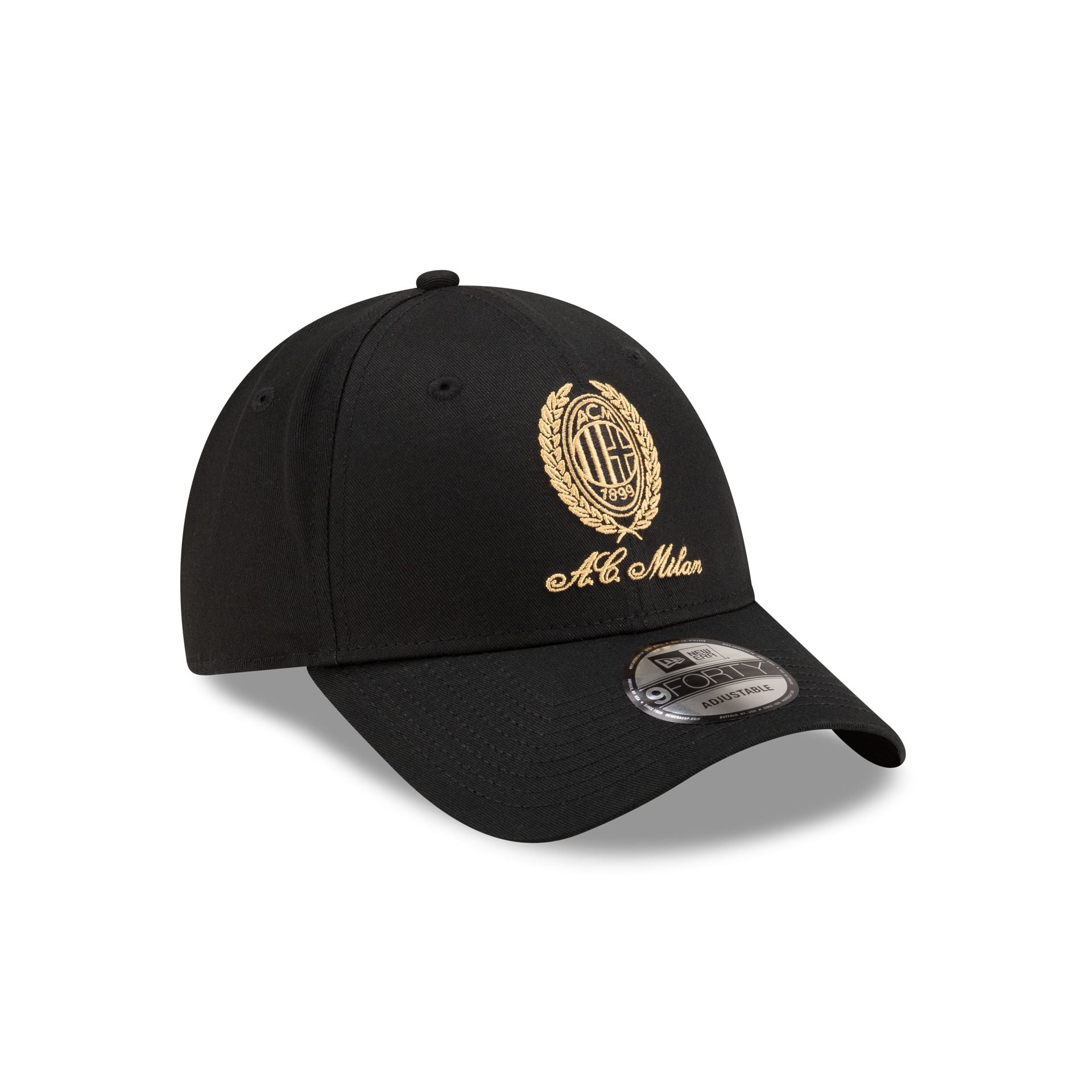 The AC Milan Heritage Gold Black 9FORTY Adjustable Cap features a rubber Milan patch at the front panels with an adjustable D-Ring closure at the rear and a black undervisor.