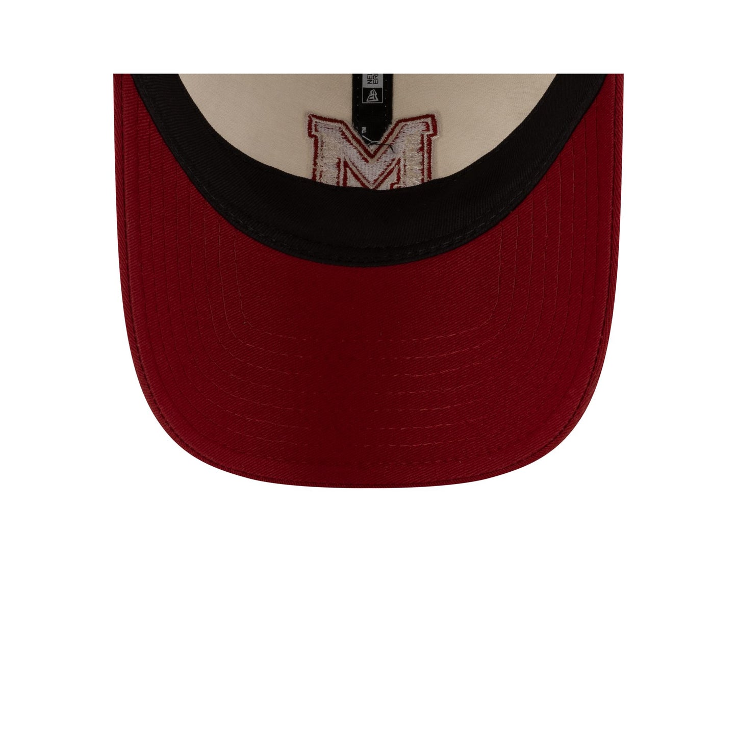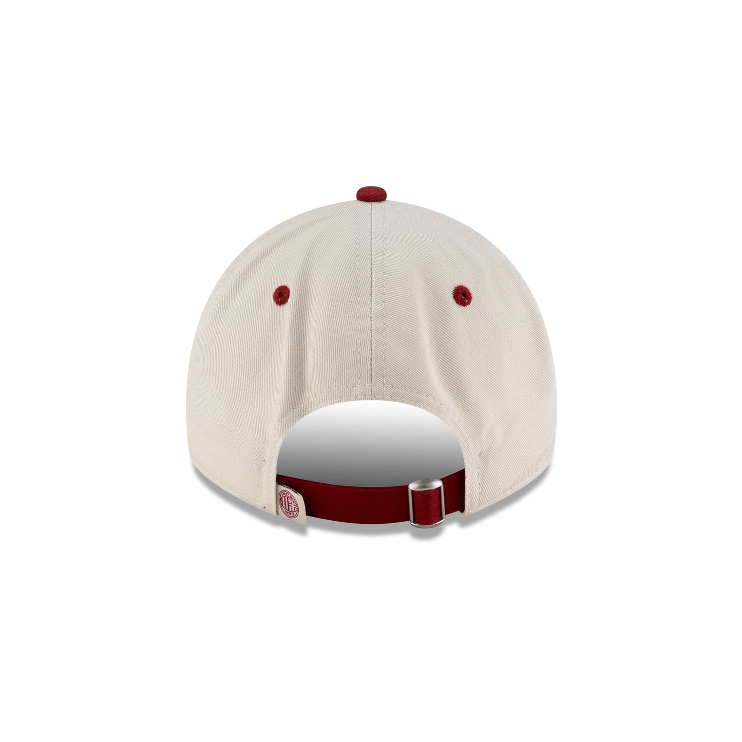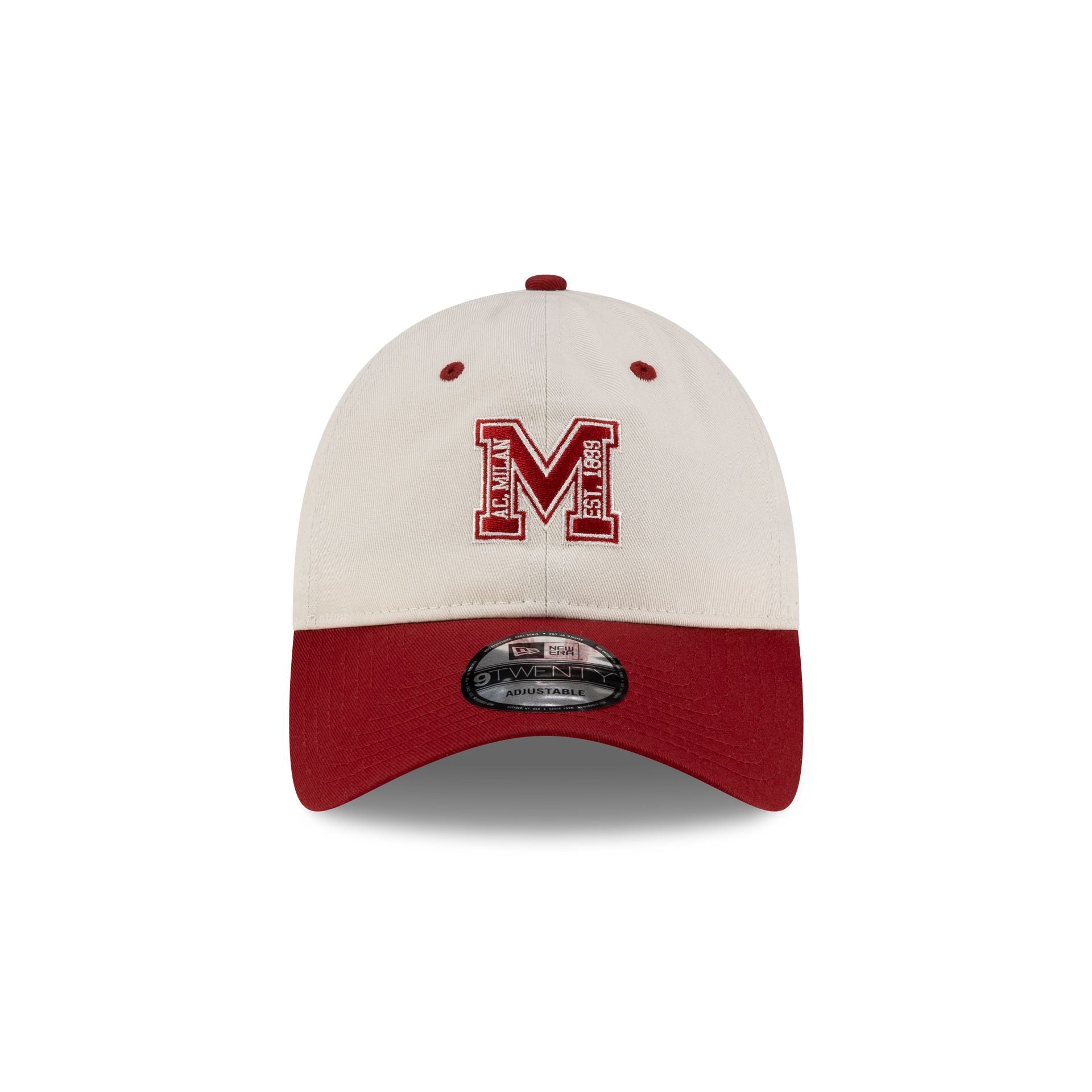 The AC Milan M Logo Red 9TWENTY Adjustable Cap features an embroidered Milan logo at the front panels with a red visor and a woven team logo tag at an adjustable D-Ring closure at the rear.