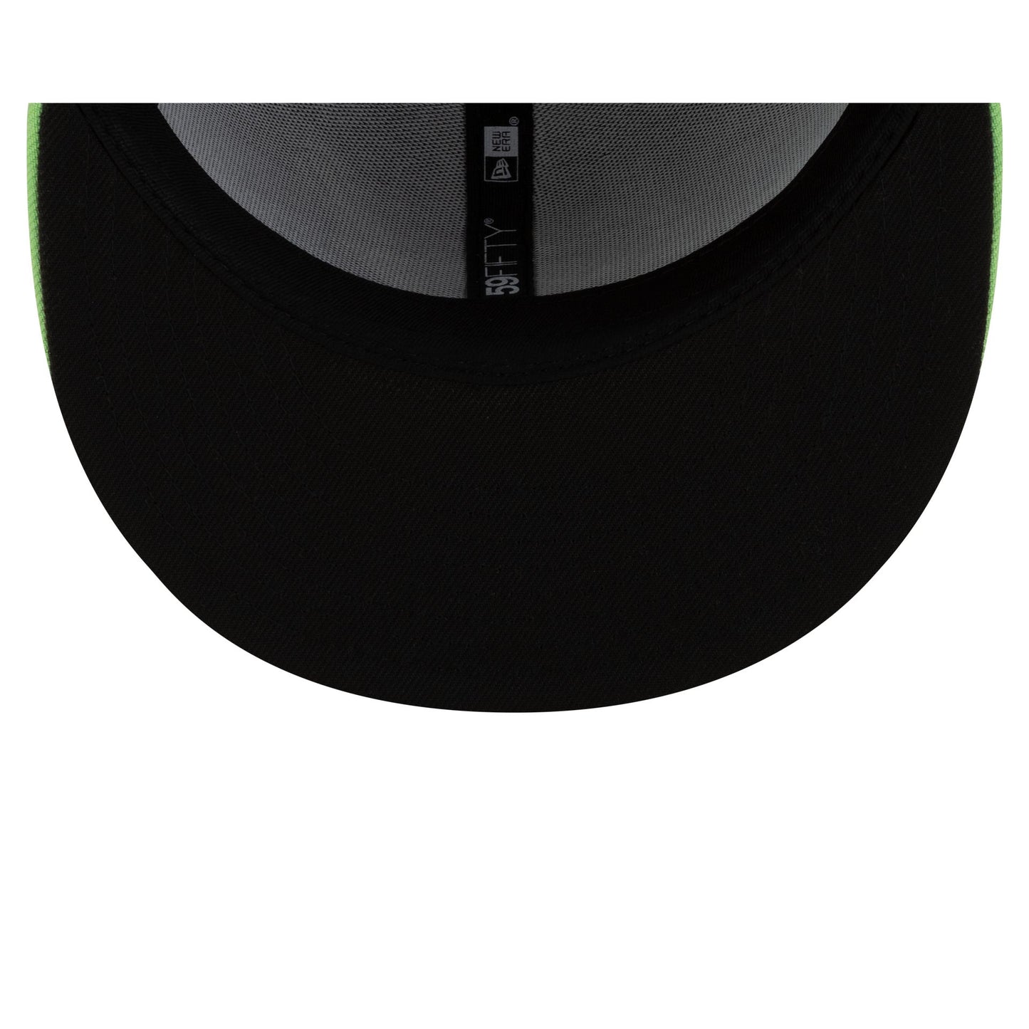 The Akron RubberDucks Black Food Pack 59FIFTY Fitted Cap features an embroidered RubberDucks cheeseburger themed logo at the front panels with a matching MiLB Batterman logo at the rear. Additional details include a Galley Boys team wordmark at the right-wear side with a green visor and a black undervisor.