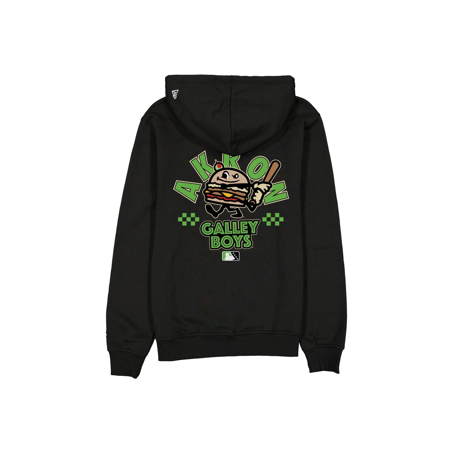 The Akron RubberDucks Black Food Pack Hoodie features a screen-printed RubberDucks Galley Boys cheeseburger themed logo at the left chest with a matching graphic at the rear.
