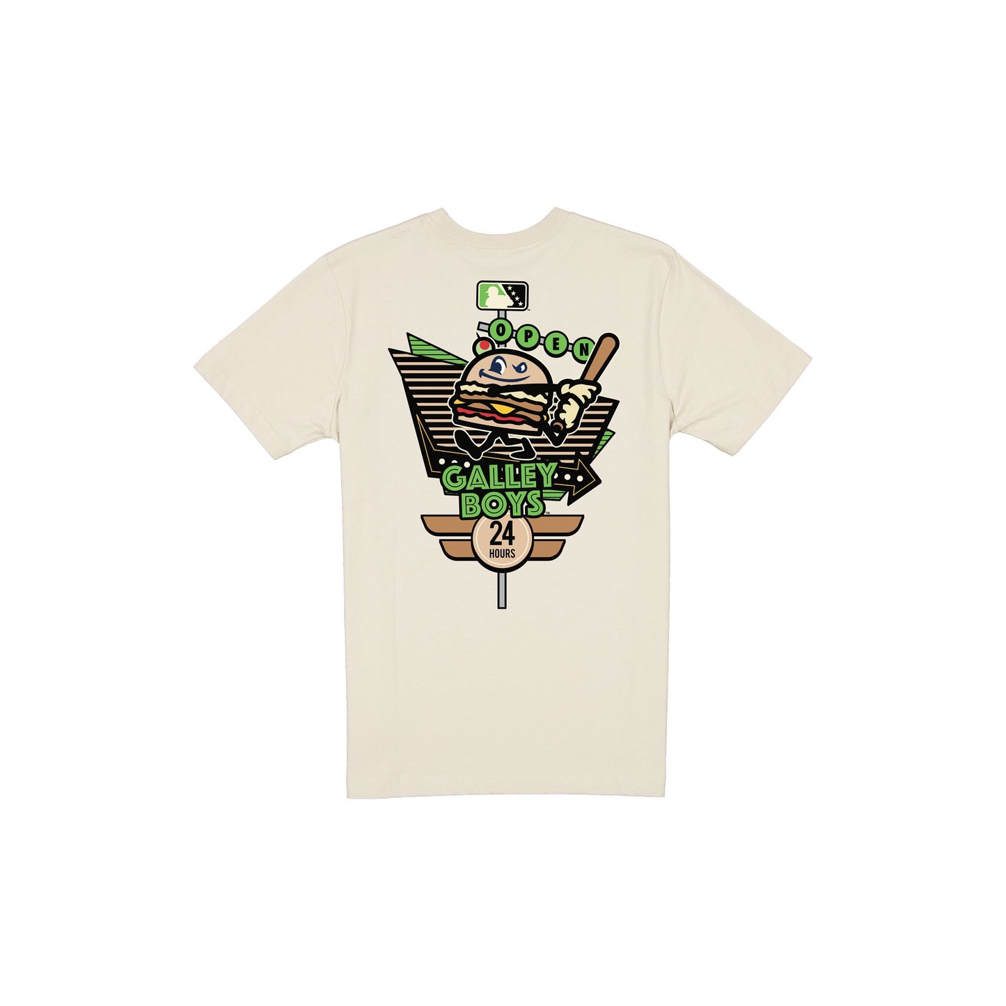 The Akron RubberDucks Chrome Food Pack T-Shirt features a screen-printed RubberDucks Galley Boys cheeseburger themed logo at the left chest with a matching graphic at the rear.