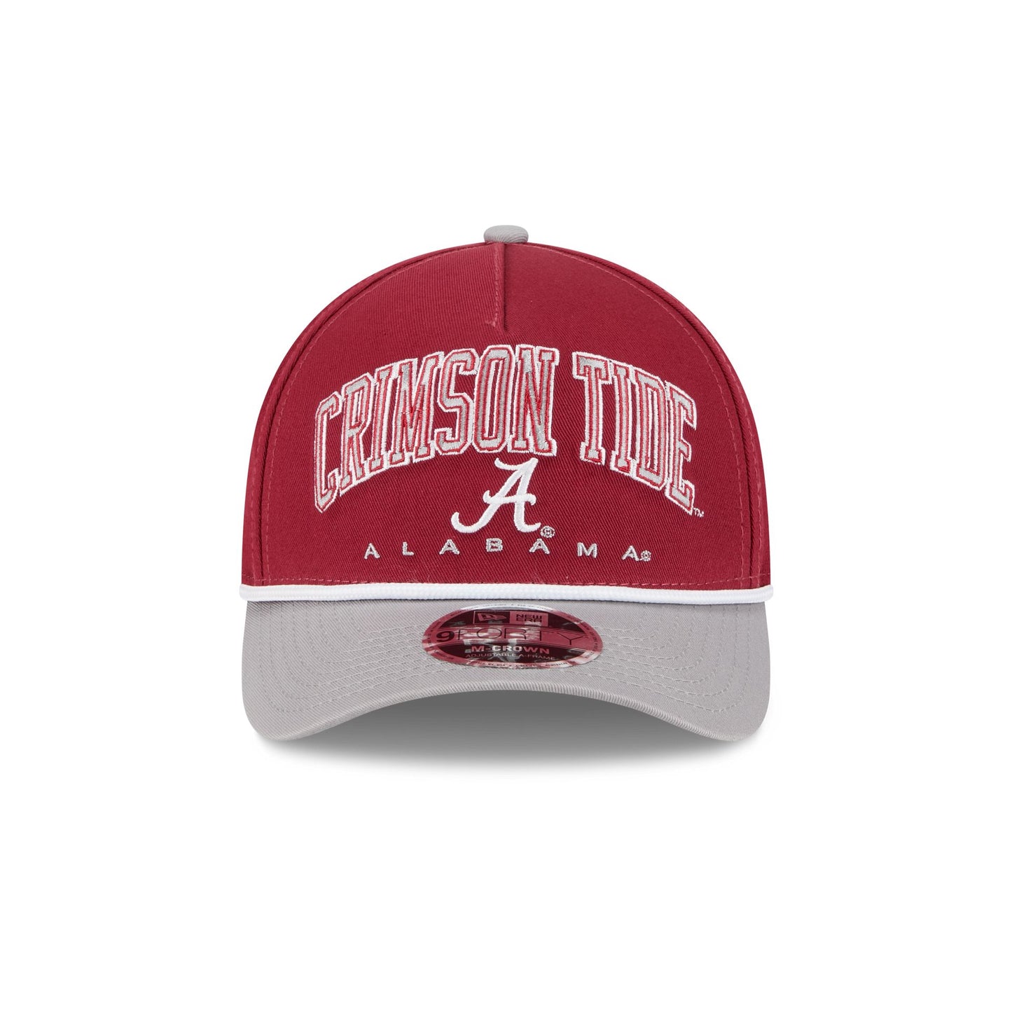 The Alabama Crimson Tide Arch 9FORTY M-Crown A-Frame Snapback features an embroidered Crimson Tide Alternate graphic at the front panels with a rope at the visor. Additional details include an adjustable snapback closure at the rear with a gray undervisor.