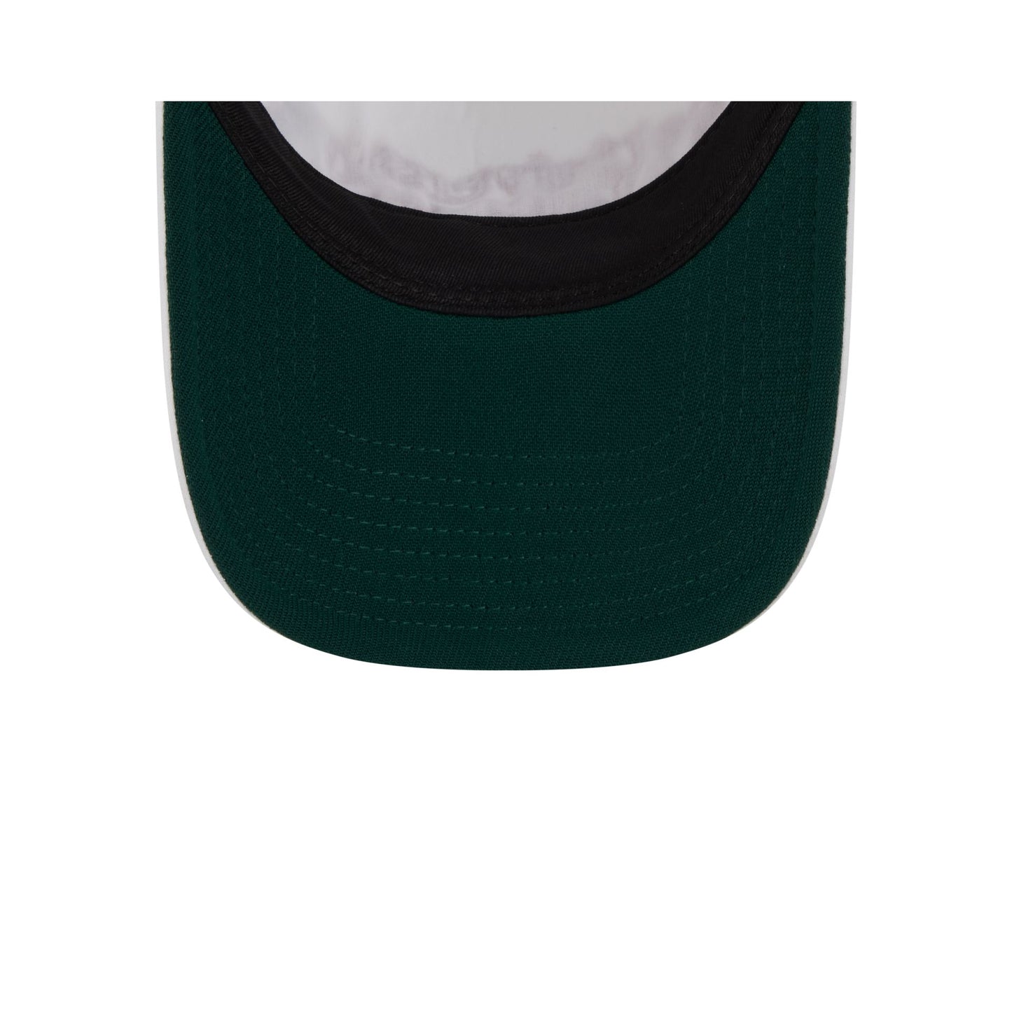 The Alabama Crimson Tide Collegiate City, State 9FORTY A-Frame Trucker features an embroidered Crimson Tide wordmark and logo above a Tuscaloosa, Alabama school location wordmark at the front panel. Additional details include an alternate team logo and City, State patch at the right-wear side with an adjustable snapback closure at the rear and a green undervisor.