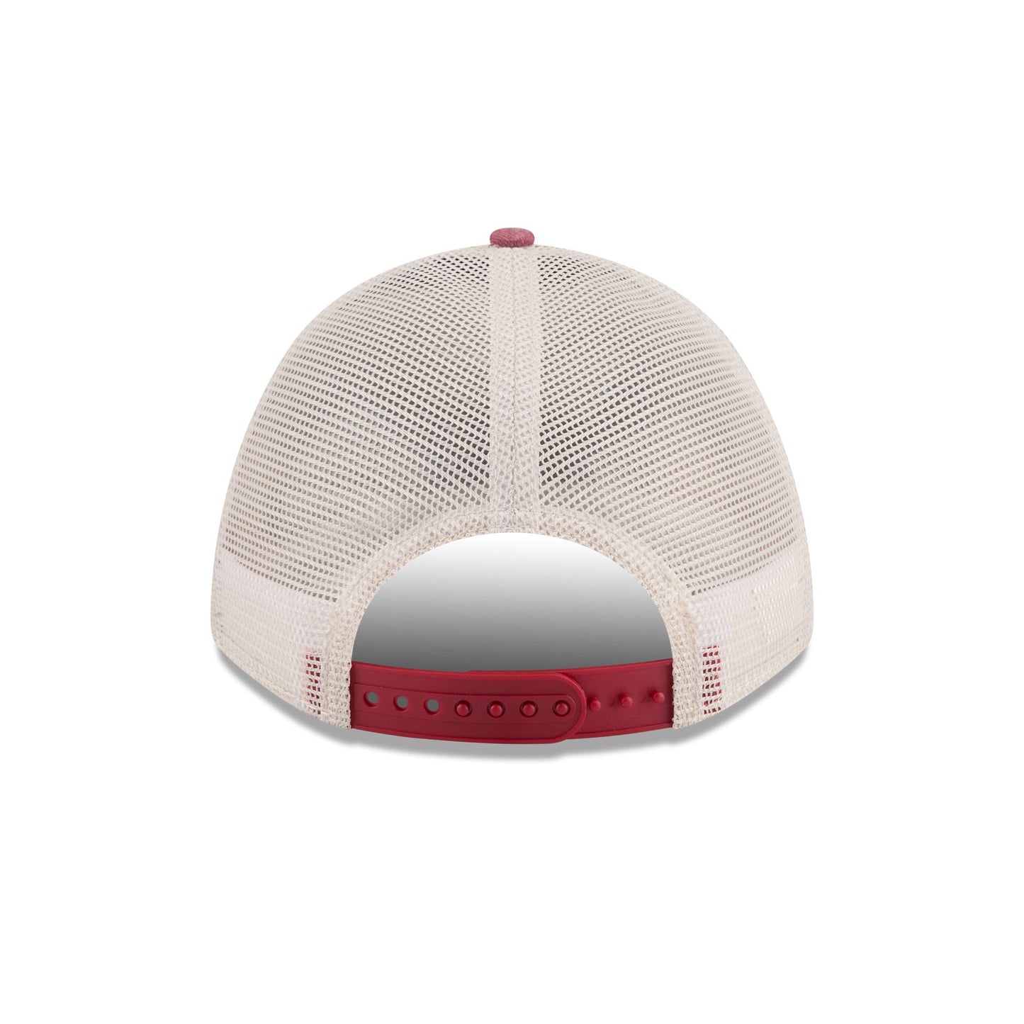 The Alabama Crimson Tide Frayed 9FORTY M-Crown A-Frame Trucker features an embroidered frayed Crimson Tide circle graphic at the front panels with a denim visor. Additional details include an adjustable snapback closure at a mesh rear and a gray undervisor.
