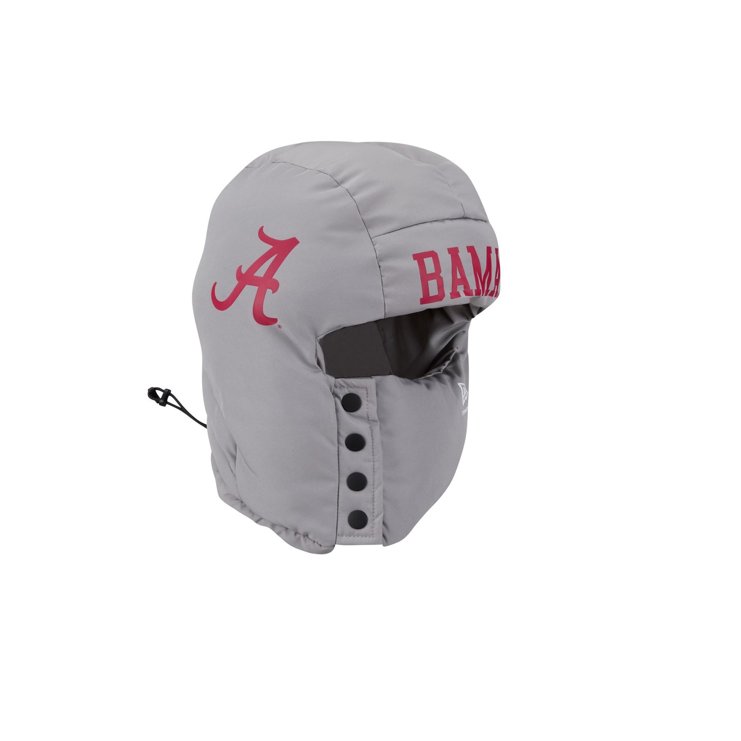 The Alabama Crimson Tide Helmet Puffer Hood features an embroidered Crimson Tide wordmark at the front with a helmet design at each side. Additional details include an insulated filling with adjustable drawstrings at the back of the head and neck. The puffer helmet has a 4 snap-button closure at the right.
