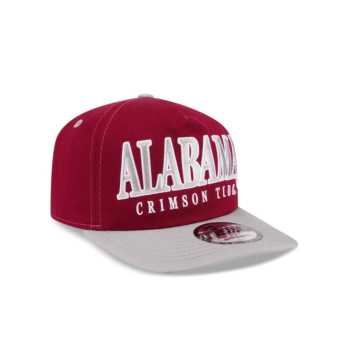 The Alabama Crimson Tide March Madness 19TWENTY Snapback features an embroidered Crimson Tide wordmark with a team logo across the front panel and left-wear side. Additional details include an adjustable snapback closure at the rear with a gray visor and a green undervisor.