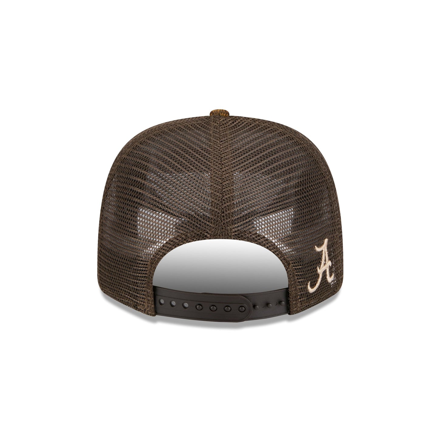 The Alabama Crimson Tide Wool Plaid 9SEVENTY Trucker features an embroidered Crimson Tide badge at the front panels with a matching team logo at the right of an adjustable stretch-snap closure at the rear and a brown undervisor.
