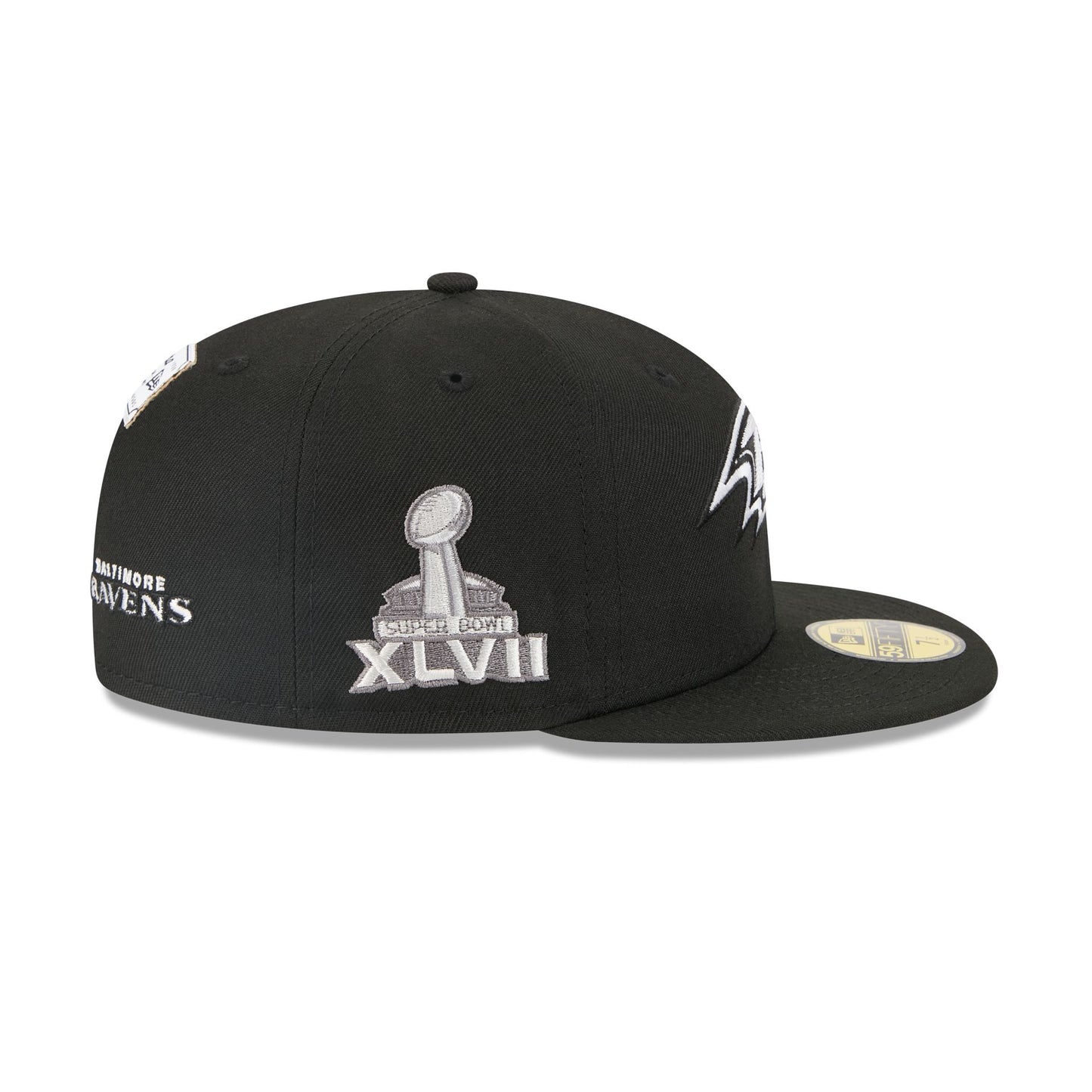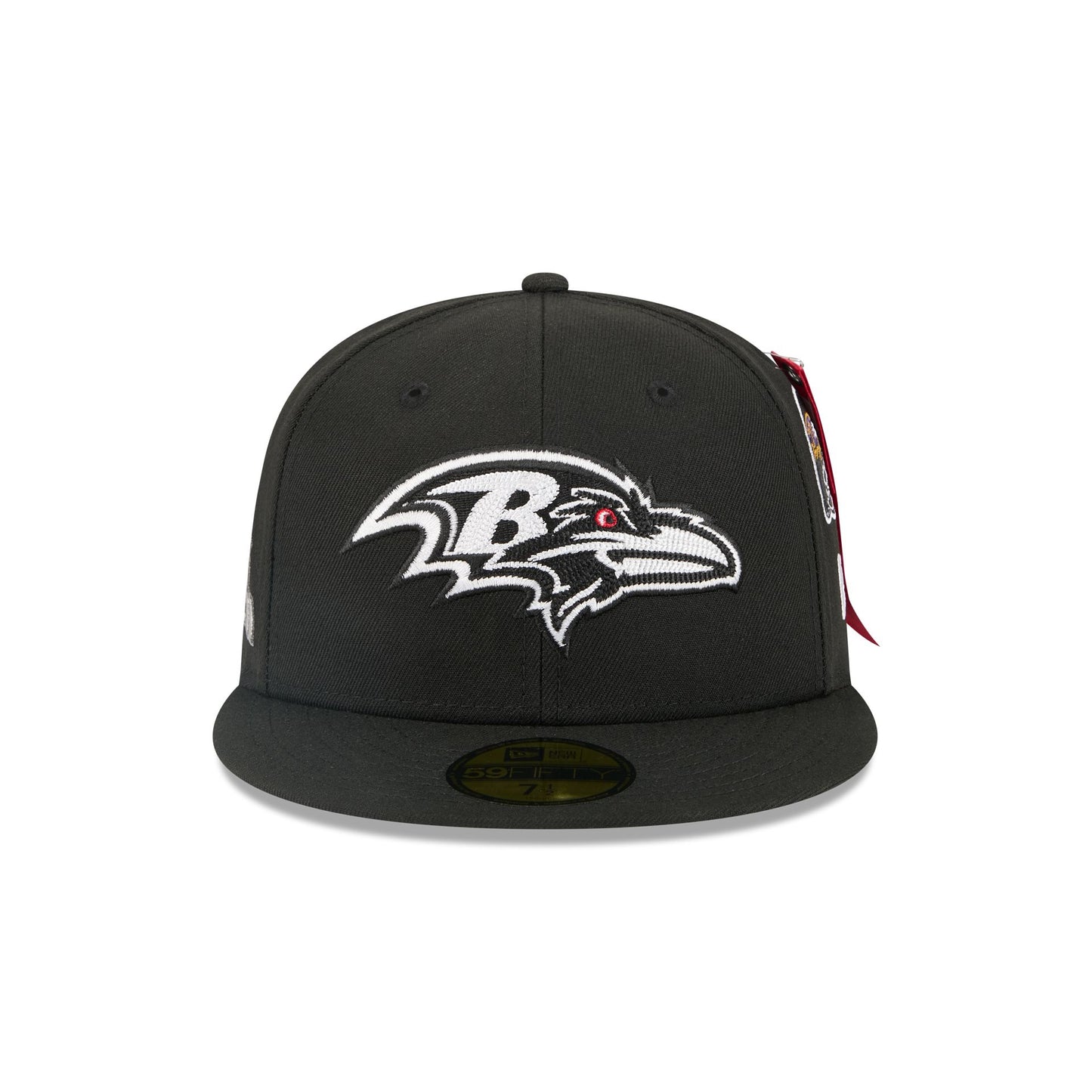 The Alpha Industries x Baltimore Ravens Black 59FIFTY Fitted Cap features an embroidered black and white Ravens logo at the front panels with a signature Alpha Industries red ribbon and an alternate team logo at the left-wear side and a Super Bowl XLVII patch at the right-wear side. Additional details include a woven New Era Cap x Alpha Industries tag above a matching NFL Shield at the rear with an BLANK patch to the left and a team wordmark to the right.