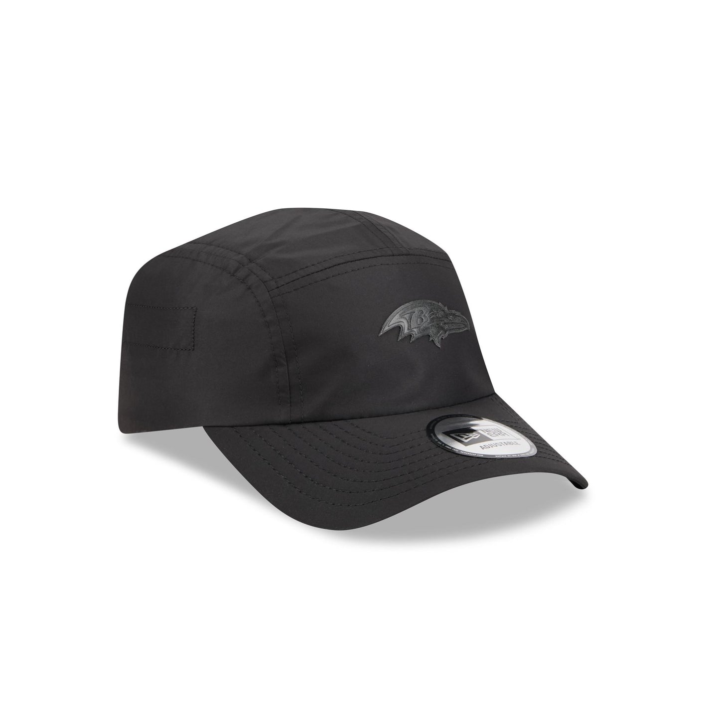 The Alpha Industries x Baltimore Ravens Black Runner Adjustable Cap features a silicone Ravens logo at the front with a woven New Era Cap x Alpha Industries tag above an adjustable Alpha Industries red ribbon strapback closure at the rear.