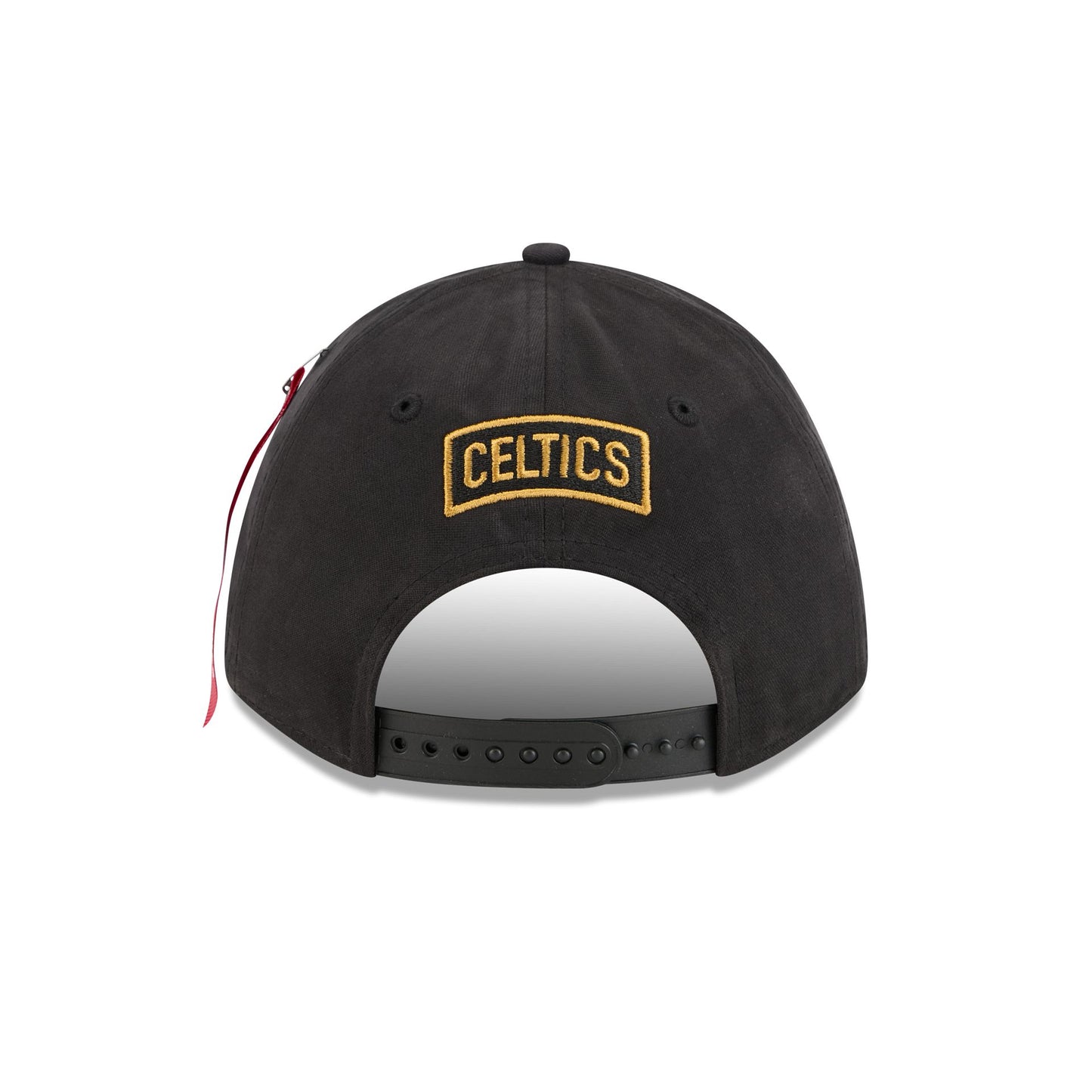 The Alpha Industries x Boston Celtics Black 9FORTY M-Crown A-Frame Snapback features a gold embroidered Celtics logo at the front with a matching team wordmark above a snapback closure at the rear. Additional details include the signature Alpha Industries red ribbon at the left-wear side with embroidered gold leaf details at the visor and a black undervisor.
