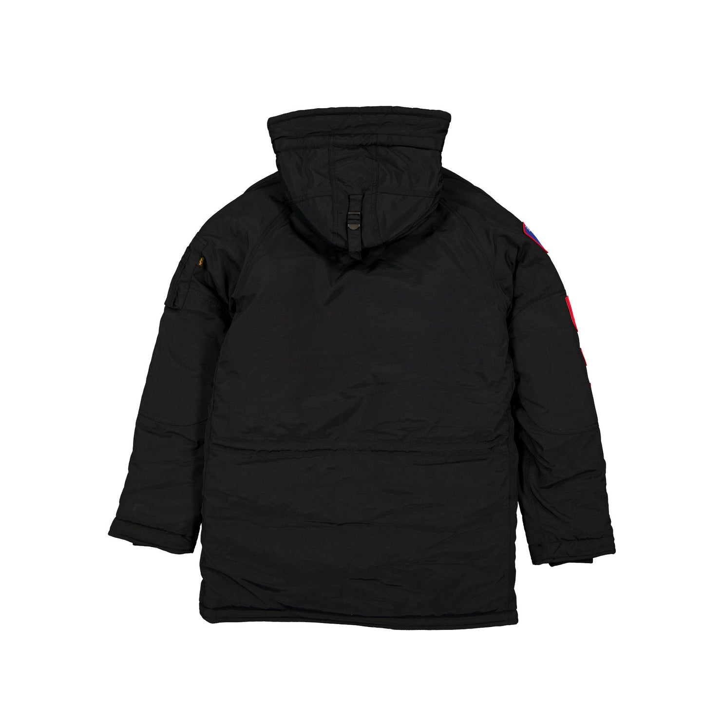 The Alpha Industries x Buffalo Bills Black N-3B Parka Jacket features an embroidered Bills logo at the left chest with alternate team logos, an AFC logo, and a Lets Go Buffalo patch at the front. Additional details include a Buffalo Bills Est. 1960, American Football Conference script above the snap button closure pocket with a utility pocket with the signature Alpha Industries red ribbon at the left sleeve, a team wordmark and logo at the right sleeve. Further details include a full-zip, snap button closure at the front with a woven New Era Cap x Alpha Industries tag at the hem and New Era shoulder straps at the interior.