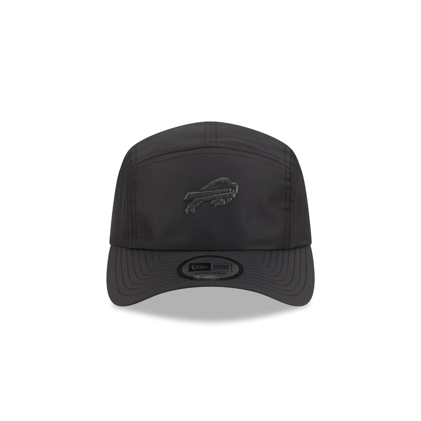 The Alpha Industries x Buffalo Bills Black Runner Adjustable Cap features a silicone Bills logo at the front with a woven New Era Cap x Alpha Industries tag above an adjustable Alpha Industries red ribbon strapback closure at the rear.