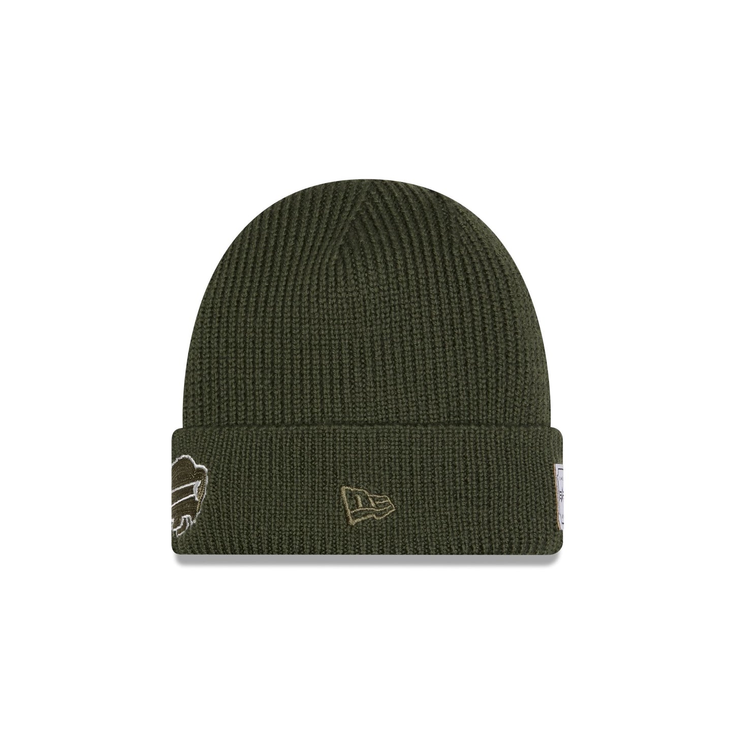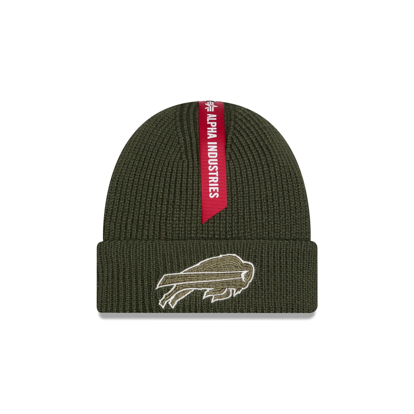 The Alpha Industries x Buffalo Bills Olive Green Cuff Knit features an embroidered green and white Bills logo at the front with the signature Alpha Industries red ribbon at the crown and a woven New Era Cap x Alpha Industries tag at the rear.