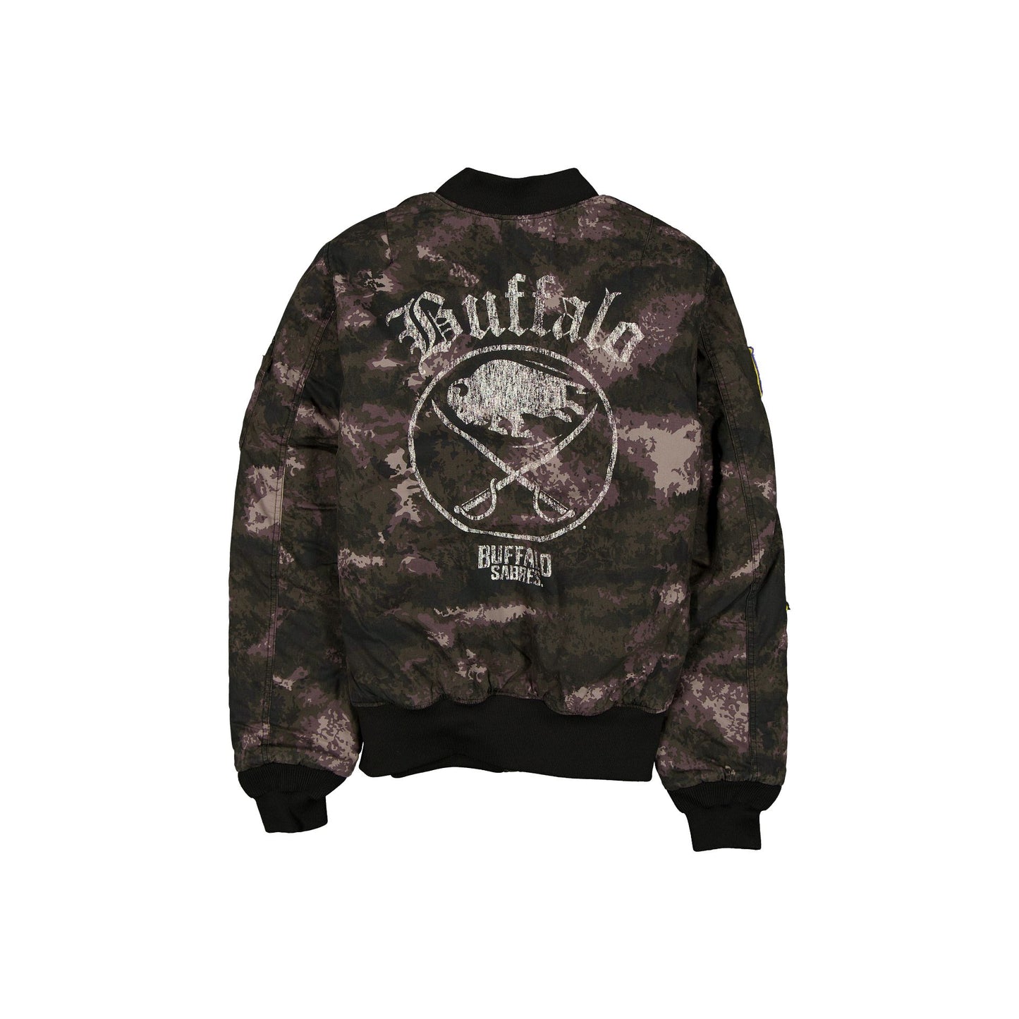 The Alpha Industries x Buffalo Sabres Black Camo MA-1 Bomber Jacket features a screen-printed Sabres logo at the right chest with a matching team graphic at the rear, a full-zip closure at the front, and a woven New Era Cap x Alpha Industries tag at the hem. Additional details include a frayed edge alternate team logo at the left chest with a Buffalo flag, New Era Cap patch, and New York flower patch at the right sleeve. Further details include the KeyBank Center arena blueprint at the interior lining.