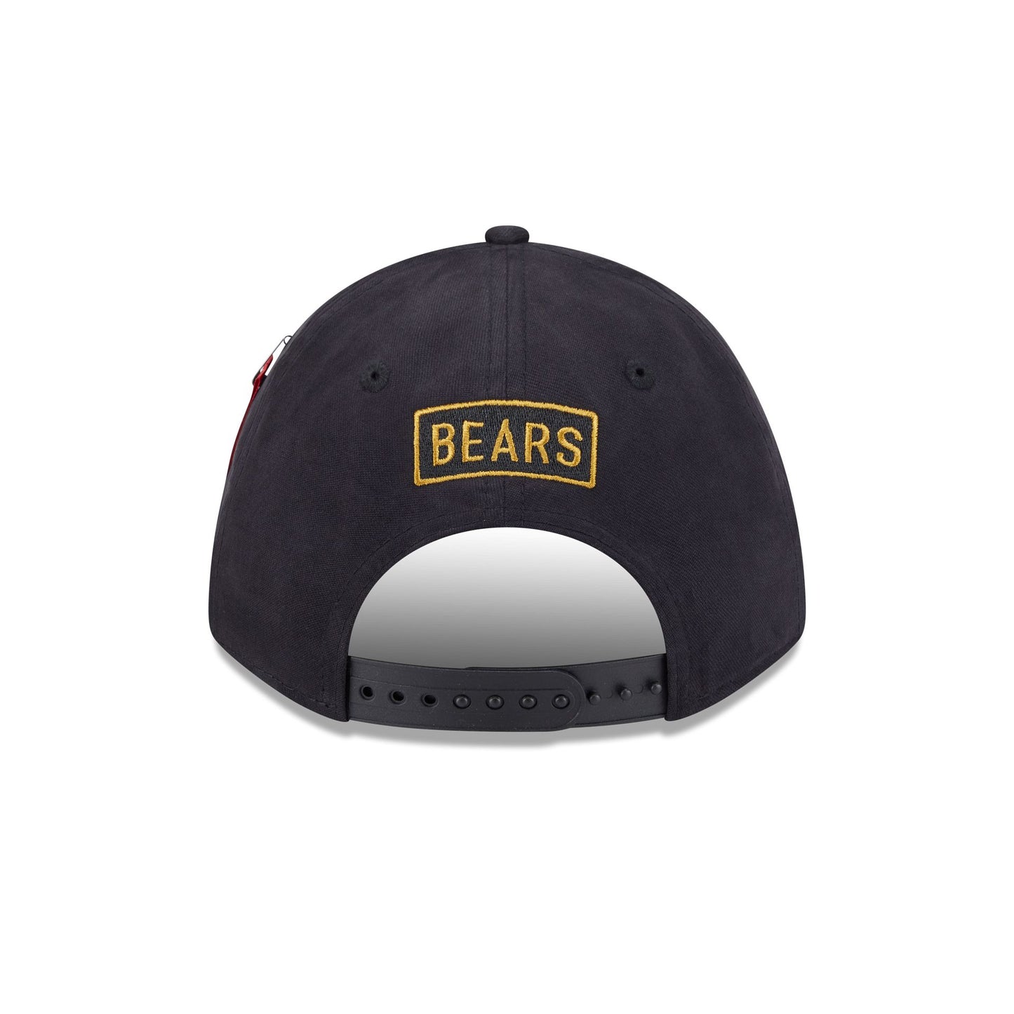 The Alpha Industries x Chicago Bears Black 9FORTY M-Crown A-Frame Snapback features a gold embroidered Bears logo at the front with a matching team wordmark above a snapback closure at the rear. Additional details include the signature Alpha Industries red ribbon at the left-wear side with embroidered gold leaf details at the visor and a black undervisor.