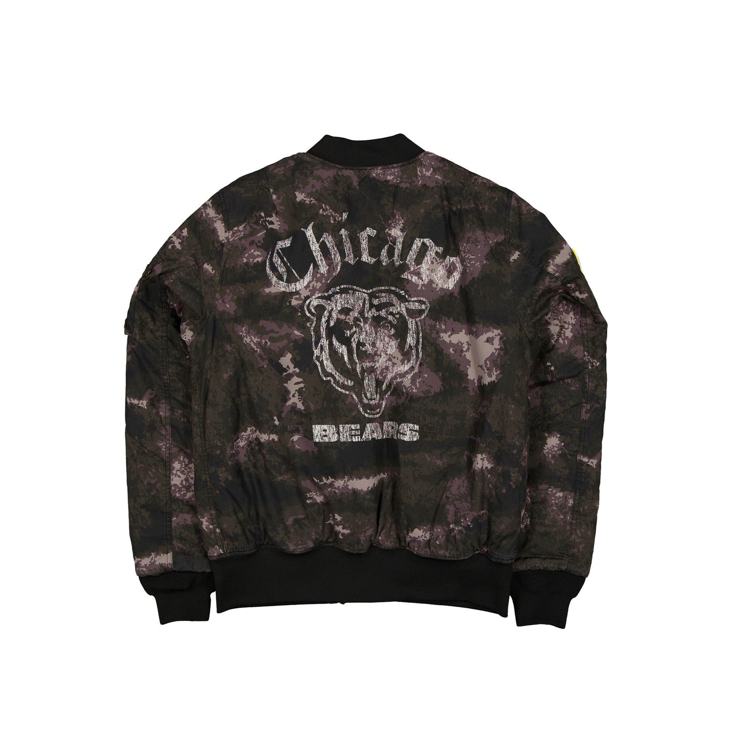 The Alpha Industries x Chicago Bears Black Camo MA-1 Bomber Jacket features a screen-printed Bears logo at the right chest with a matching team graphic at the rear, a full-zip closure at the front, and a woven New Era Cap x Alpha Industries tag at the hem. Additional details include a frayed edge alternate team logo at the left chest with a Chicago city flag, New Era Cap patch, and Illinois state flower patch at the right sleeve. Further details include the Soldier Field blueprint at the interior lining.