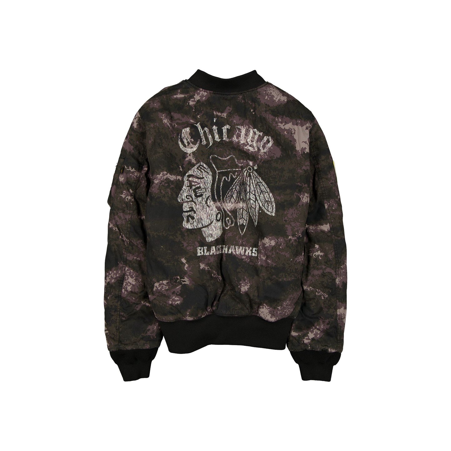 The Alpha Industries x Chicago Blackhawks Black Camo MA-1 Bomber Jacket features a screen-printed Blackhawks logo at the right chest with a matching team graphic at the rear, a full-zip closure at the front, and a woven New Era Cap x Alpha Industries tag at the hem. Additional details include a frayed edge alternate team logo at the left chest with a Chicago flag, New Era Cap patch, and Illinois flower patch at the right sleeve. Further details include the United Center arena blueprint at the interior lining.