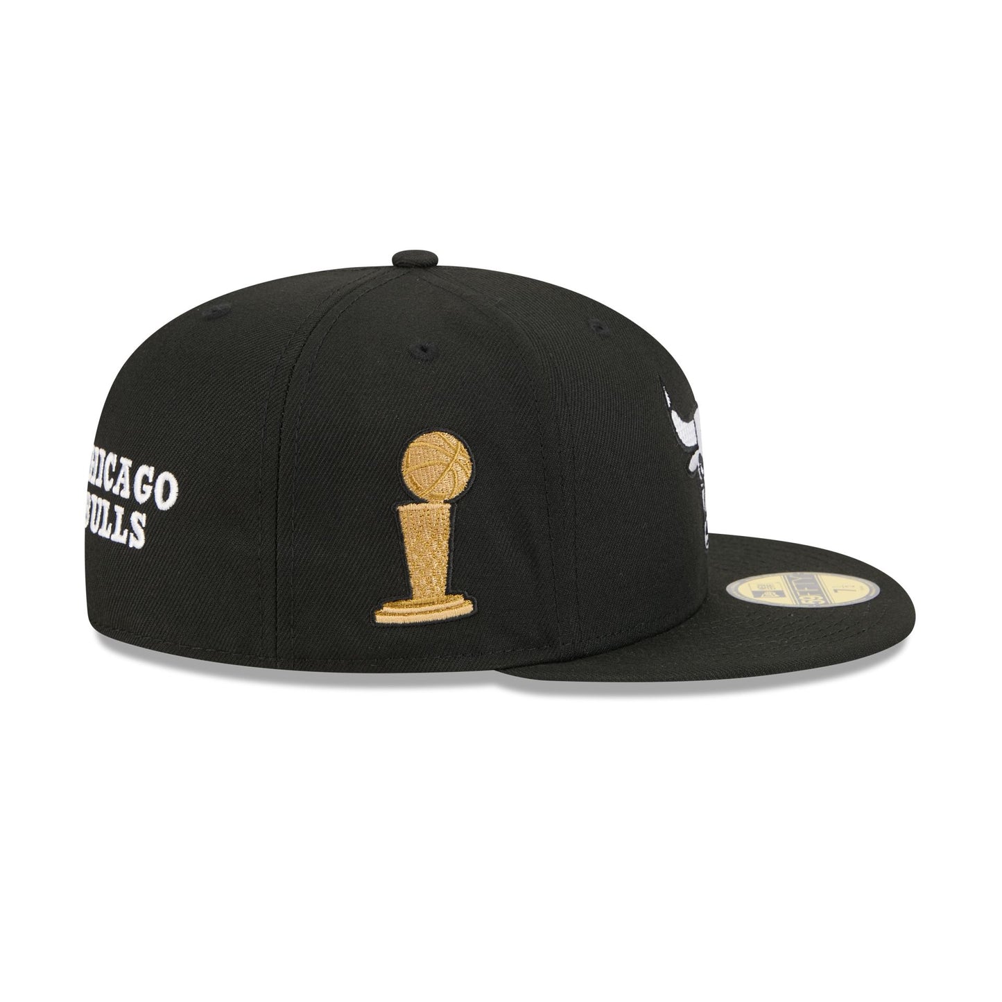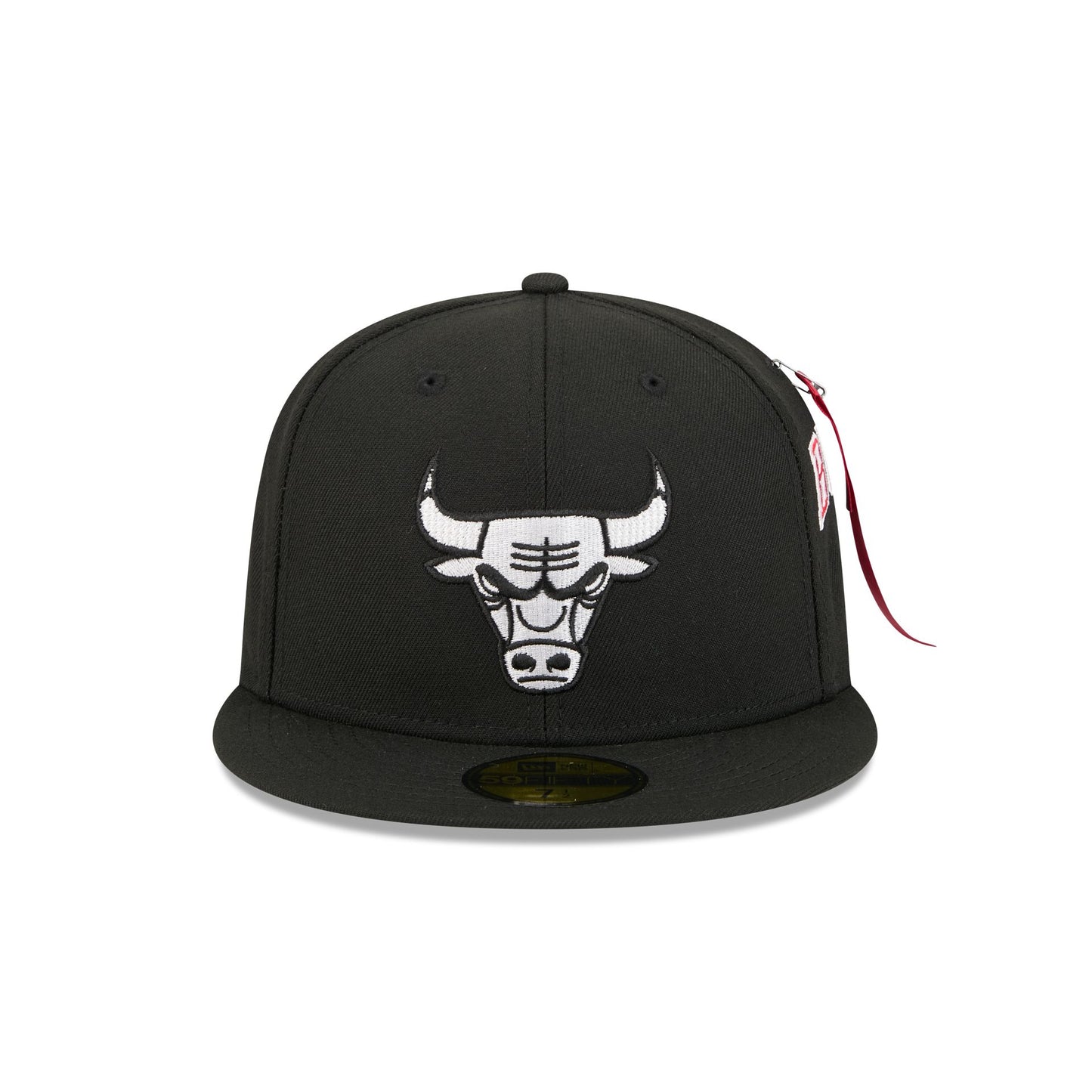 The Alpha Industries x Chicago Bulls Black 59FIFTY Fitted Cap features an embroidered black and white Bulls logo at the front panels with a signature Alpha Industries red ribbon and an alternate team logo at the left-wear side and an NBA Championship trophy patch at the right-wear side. Additional details include a woven New Era Cap x Alpha Industries tag above an official NBA Logoman at the rear with an Eastern Conference patch to the left and a team wordmark to the right.