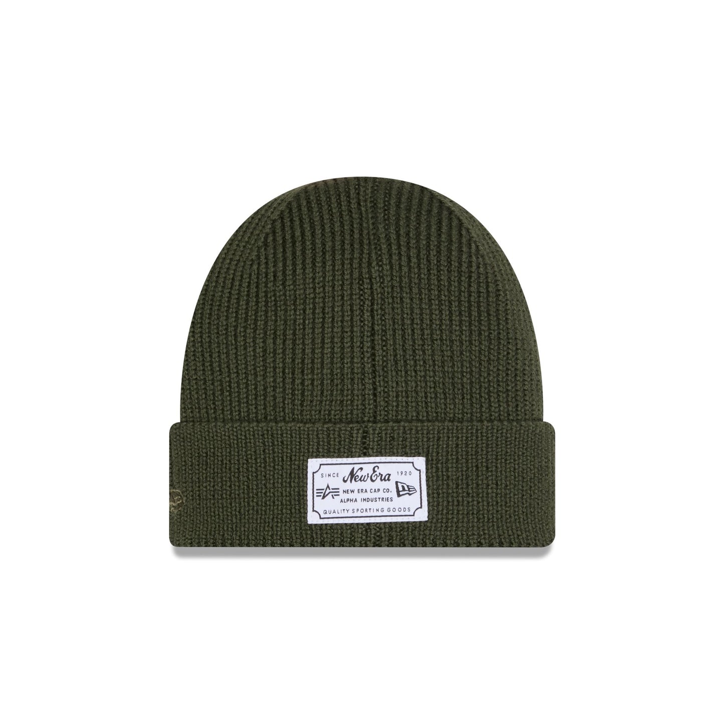 The Alpha Industries x Chicago White Sox Olive Green Cuff Knit features an embroidered green and white White Sox logo at the front with the signature Alpha Industries red ribbon at the crown and a woven New Era Cap x Alpha Industries tag at the rear.