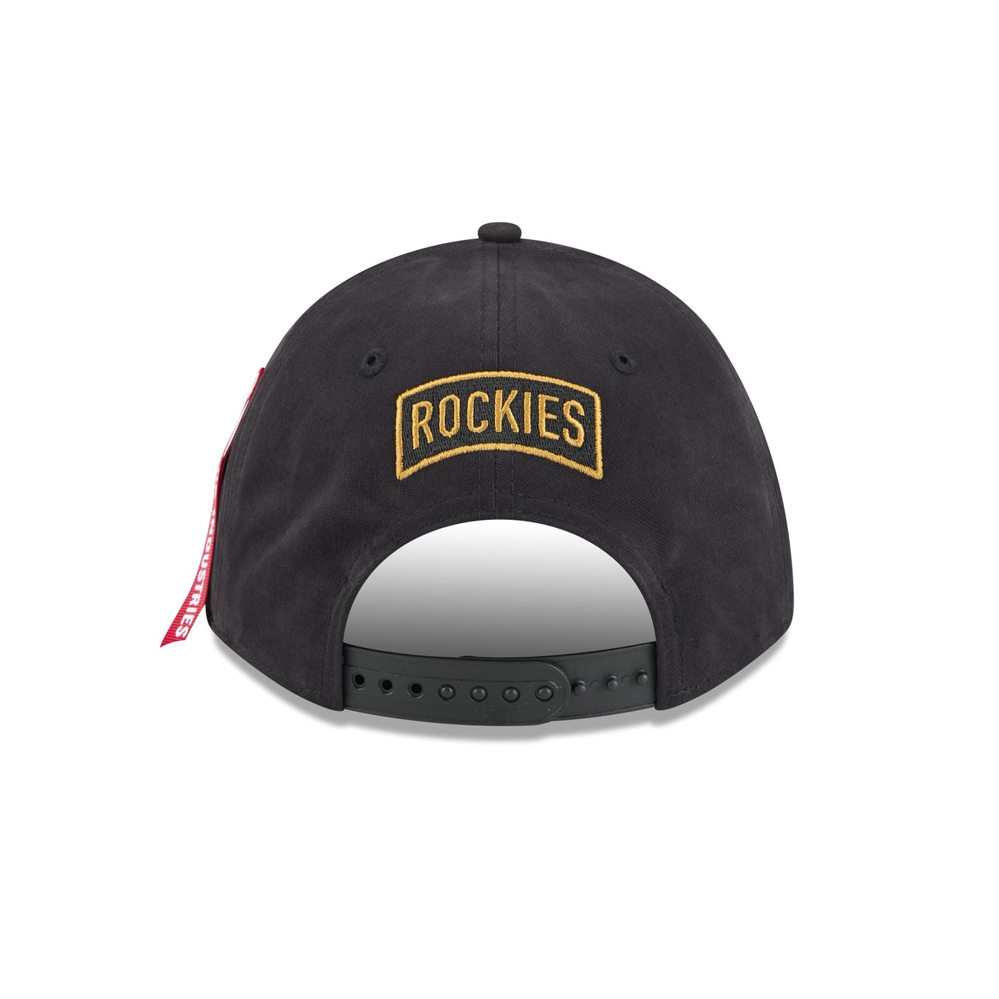 The Alpha Industries x Colorado Rockies Black 9FORTY M-Crown A-Frame Snapback features a gold embroidered Rockies logo at the front with a matching team wordmark above a snapback closure at the rear. Additional details include the signature Alpha Industries red ribbon at the left-wear side with embroidered gold leaf details at the visor and a black undervisor.