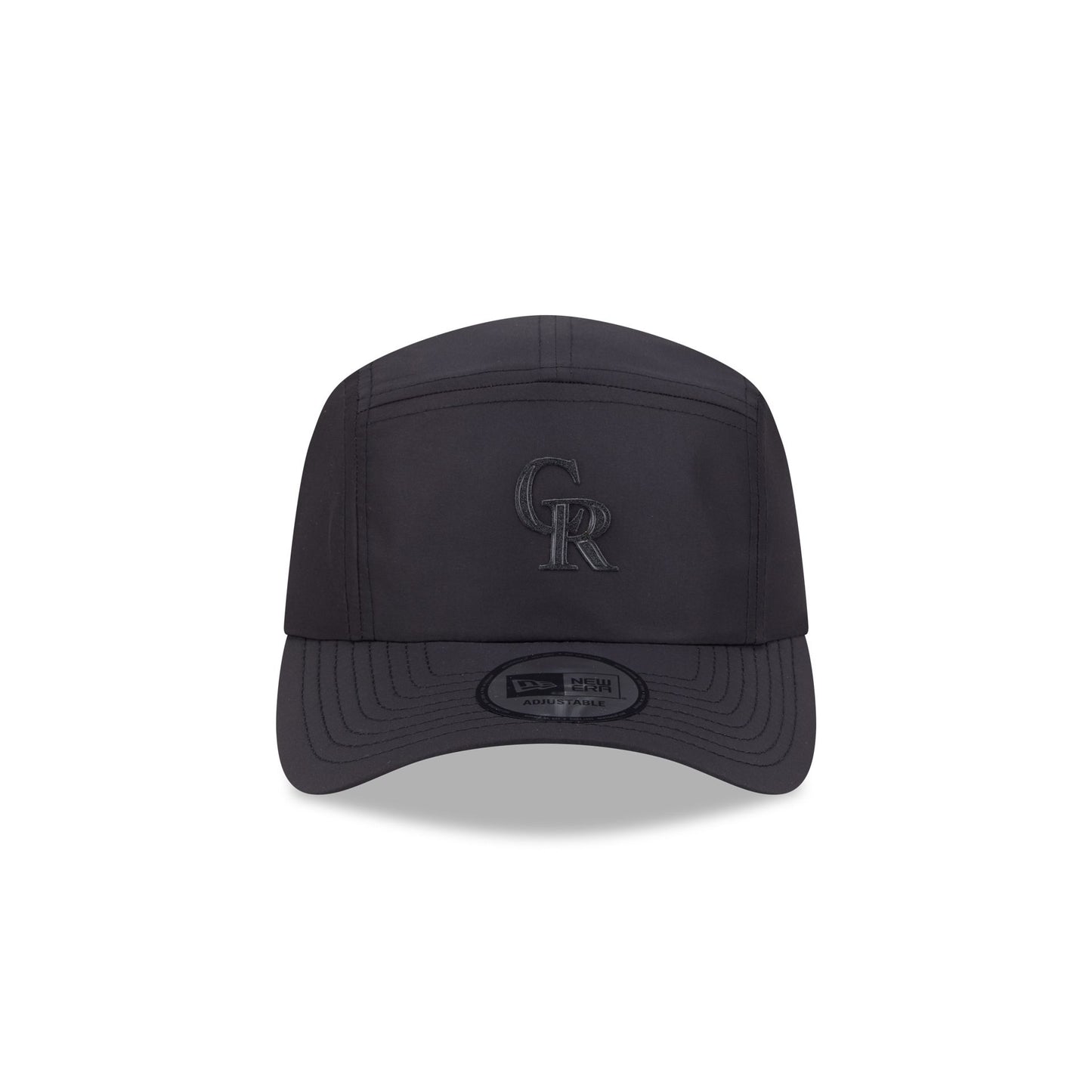 The Alpha Industries x Colorado Rockies Black Runner Adjustable Cap features a silicone Rockies logo at the front with a woven New Era Cap x Alpha Industries tag above an adjustable Alpha Industries red ribbon strapback closure at the rear.