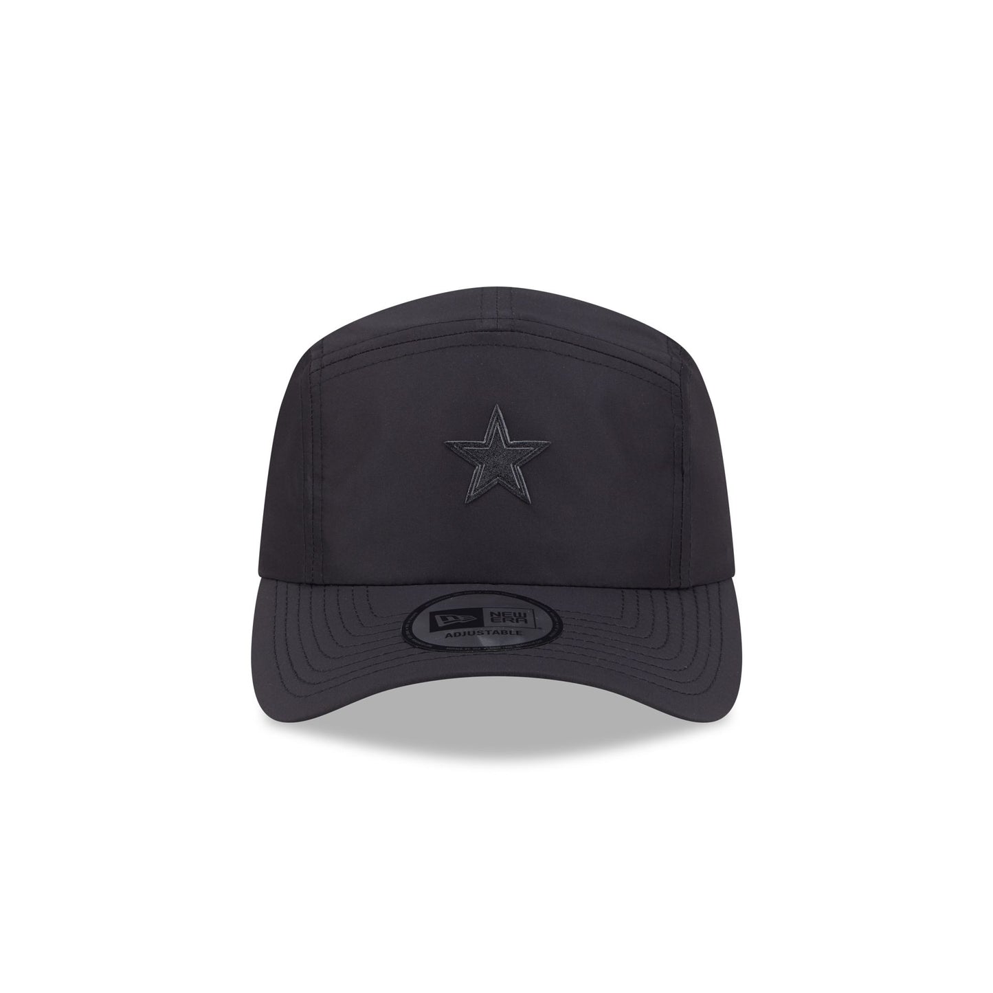 The Alpha Industries x Dallas Cowboys Black Runner Adjustable Cap features a silicone Cowboys logo at the front with a woven New Era Cap x Alpha Industries tag above an adjustable Alpha Industries red ribbon strapback closure at the rear.