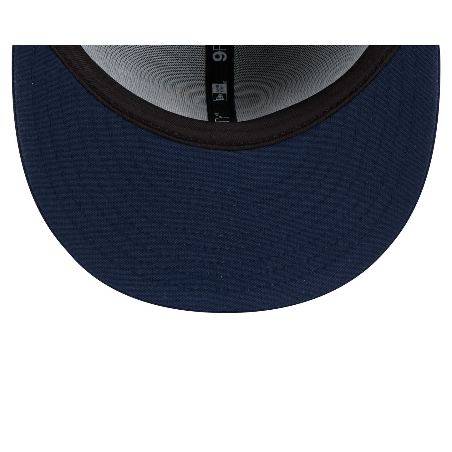 The Alpha Industries x Denver Nuggets Navy 9FIFTY Snapback features a chainstitch embroidered Nuggets logo at the front panels with a matching NBA Logoman at the right-wear side, a signature Alpha Industries red ribbon at the left-wear side, and a snapback closure at the rear.