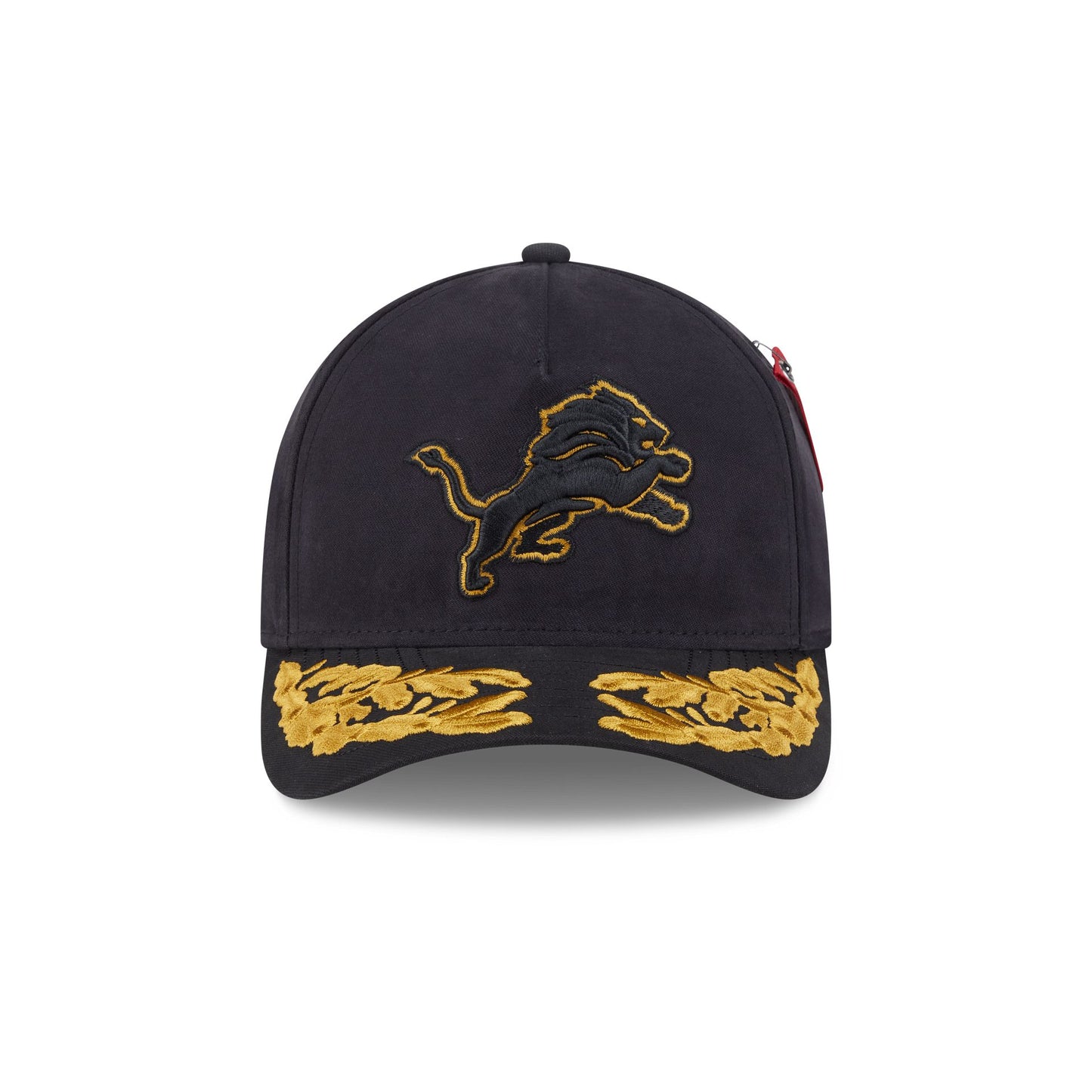 The Alpha Industries x Detroit Lions Black 9FORTY M-Crown A-Frame Snapback features a gold embroidered Lions logo at the front with a matching team wordmark above a snapback closure at the rear. Additional details include the signature Alpha Industries red ribbon at the left-wear side with embroidered gold leaf details at the visor and a black undervisor.