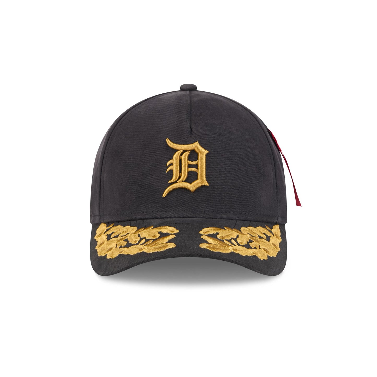The Alpha Industries x Detroit Tigers Black 9FORTY M-Crown A-Frame Snapback features a gold embroidered Tigers logo at the front with a matching team wordmark above a snapback closure at the rear. Additional details include the signature Alpha Industries red ribbon at the left-wear side with embroidered gold leaf details at the visor and a black undervisor.