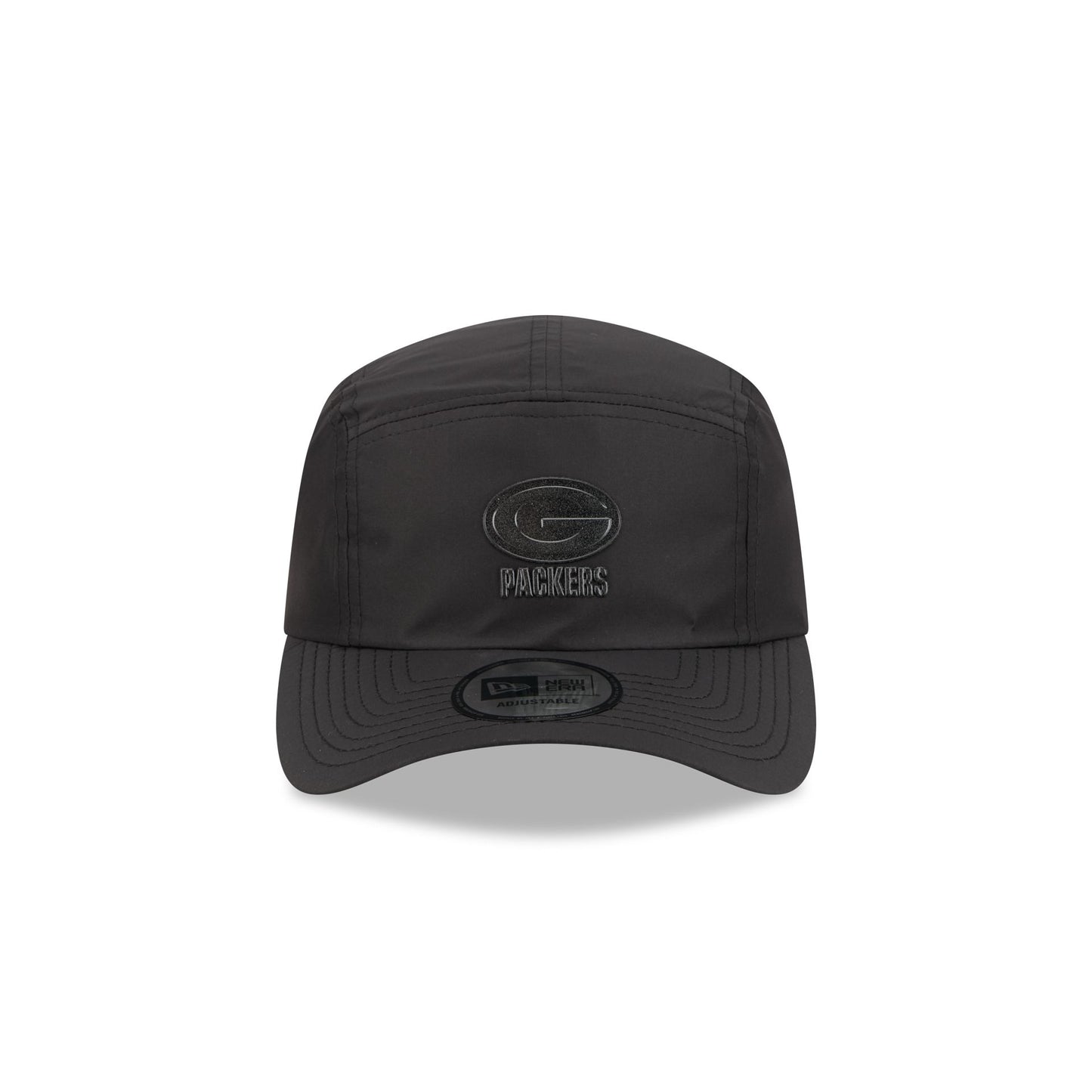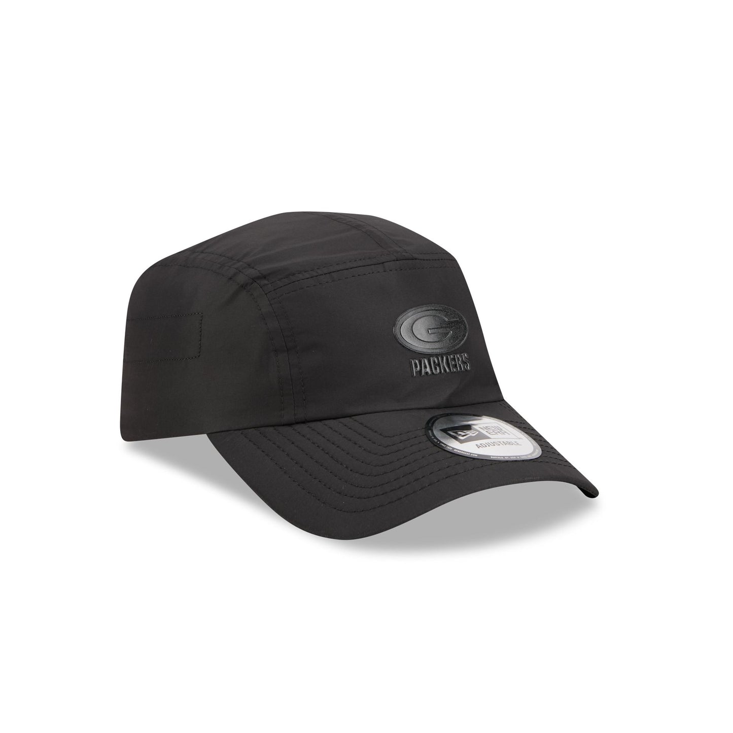 The Alpha Industries x Green Bay Packers Black Runner Adjustable Cap features a silicone Packers logo at the front with a woven New Era Cap x Alpha Industries tag above an adjustable Alpha Industries red ribbon strapback closure at the rear.