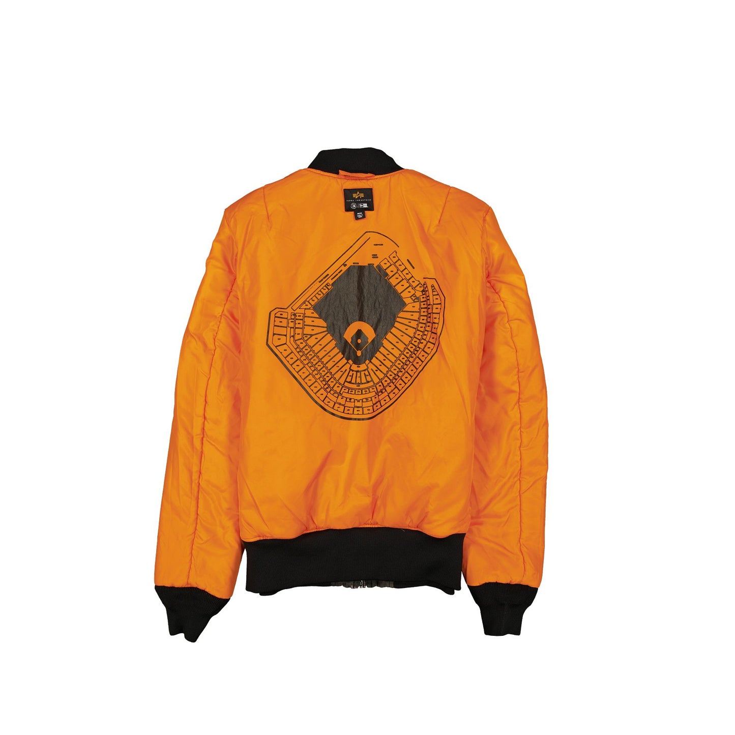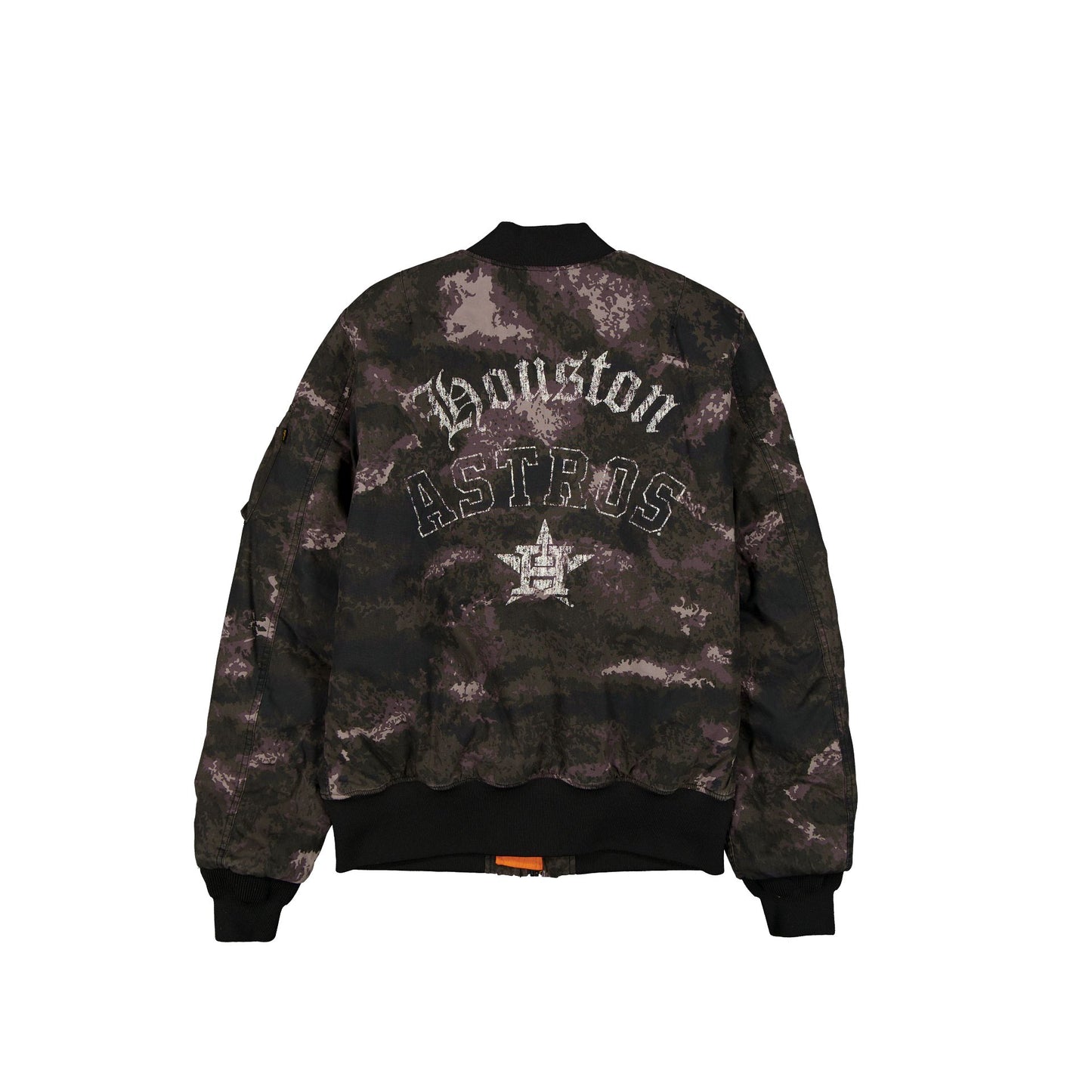 The Alpha Industries x Houston Astros Black Camo MA-1 Bomber Jacket features a screen-printed Astros logo at the right chest with a matching team graphic at the rear, a full-zip closure at the front, and a woven New Era Cap x Alpha Industries tag at the hem. Additional details include frayed edge alternate team logos at the left chest with a New Era Cap patch, Texas state flag, and Texas state flower patch at the right sleeve. Further details include the Daikin Park ballpark Stadium blueprint at the interior lining.
