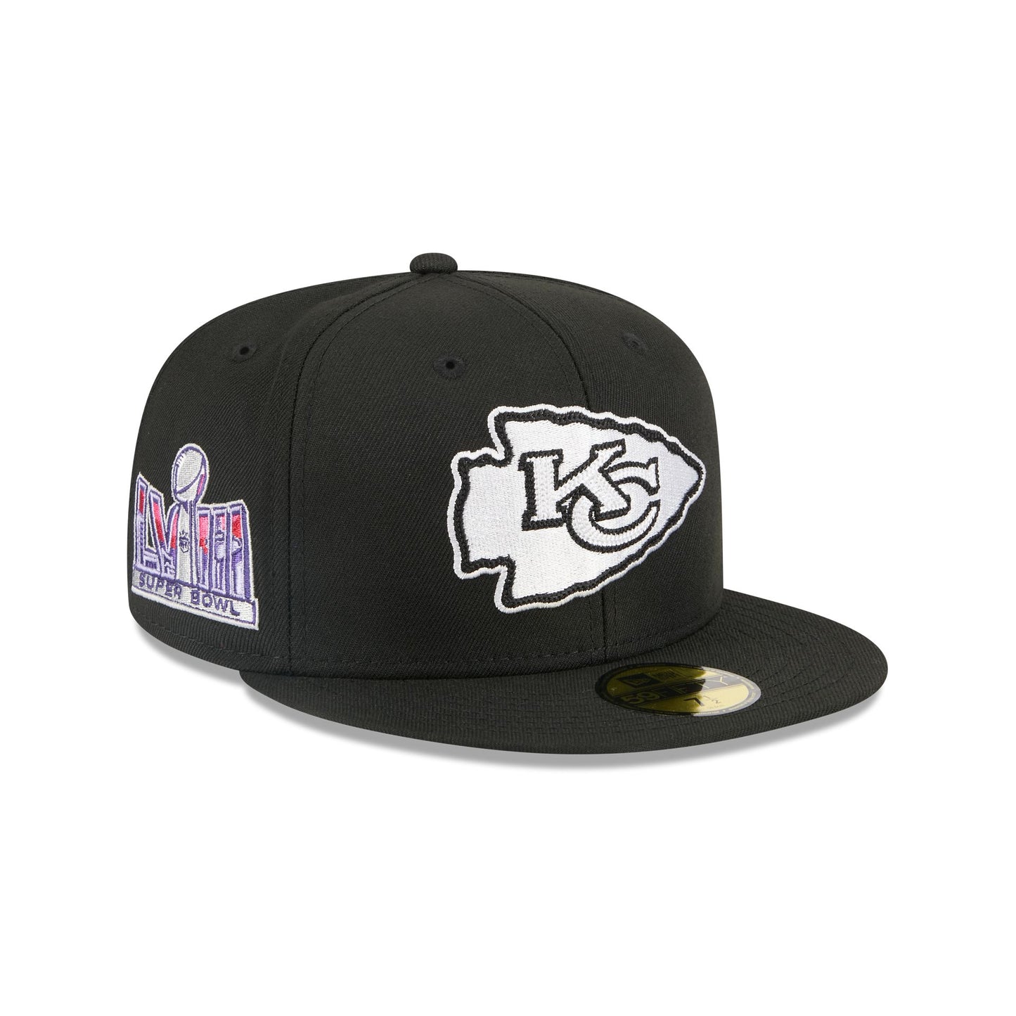 The Alpha Industries x Kansas City Chiefs Black 59FIFTY Fitted Cap features an embroidered black and white Chiefs logo at the front panels with a signature Alpha Industries red ribbon and an alternate team logo at the left-wear side and a Super Bowl LVIII patch at the right-wear side. Additional details include a woven New Era Cap x Alpha Industries tag above a matching NFL Shield at the rear with an BLANK patch to the left and a team wordmark to the right.