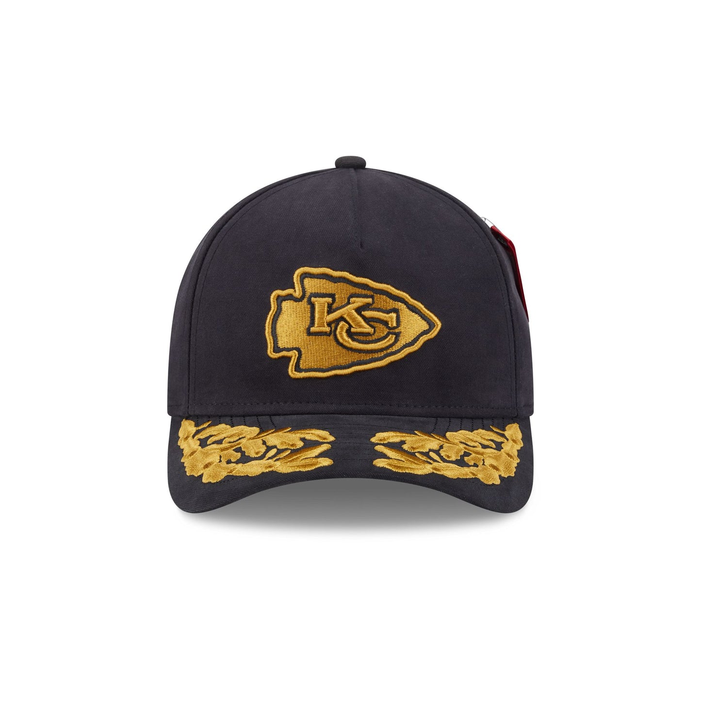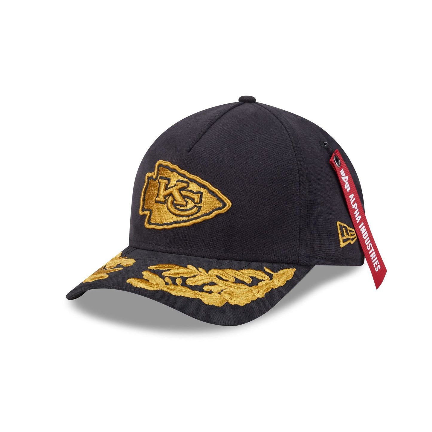 The Alpha Industries x Kansas City Chiefs Black 9FORTY M-Crown A-Frame Snapback features a gold embroidered Chiefs logo at the front with a matching team wordmark above a snapback closure at the rear. Additional details include the signature Alpha Industries red ribbon at the left-wear side with embroidered gold leaf details at the visor and a black undervisor.